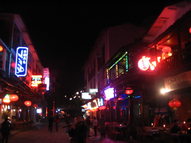 Yangshuo sits in the midst of a region famed for its geographic features, namely the large karst mountain landscape that pocks the land. This large limestone monoliths tower up over the cities and countryside, lending an impressive feel to everything. Our first day involved settling into a hotel just of the Xi Jie, or West Street, the center of the tourist trade in Yangshuo. From here we explored the city and come night time ventured a little farther afield in search of good street food. Our efforts met with success, culminating in Andrew and I sitting at a table under a tent with an Austrian named Wolfgang and two Chinese men while a teenage girl played songs in Chinese. This was all precipated by the request of the Chinese men to take a picture of us ‘laowai’ (foreigners) and then we invited them for a ‘ganbei’ (cheers). This is the course of many of my social interactions here. It was a pleasant nice and despite our insistence on getting the bill, one of the Chinese men was kind enough to cover the costs.
