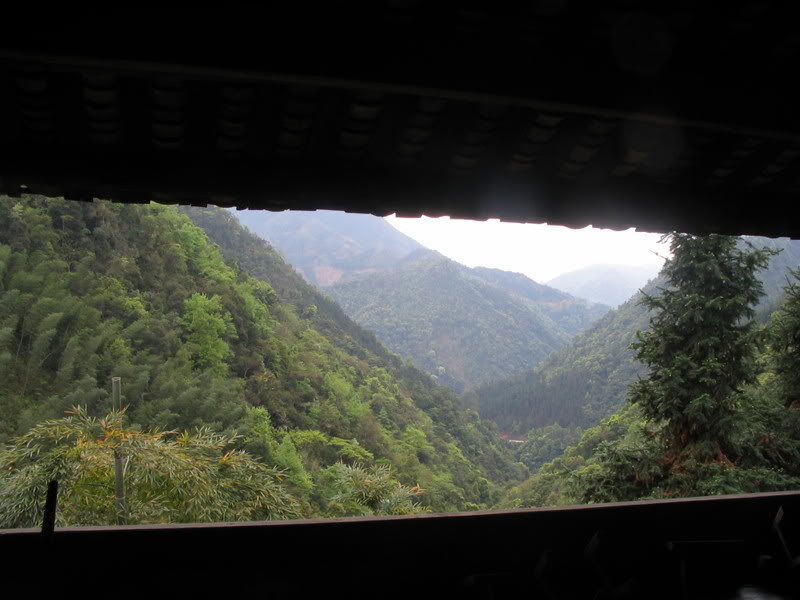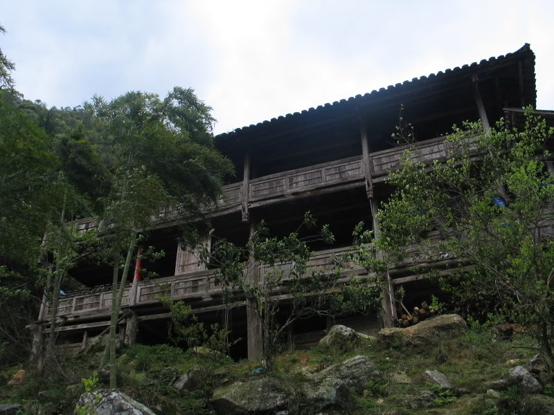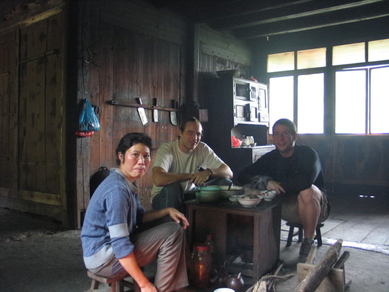 We joined her in the kitchen, squatting down on our six-inch high stools and watching her work a wok over the open fire set in a hole in the concrete floor. Her cat joined us, sniffing out the food and making its presence felt. Ultimately we were treated to a minor feast, filled with coarse rice in a soup, some fried vegetables and some of the smoked cow meat she had. It had one of the most exquisite flavors I have ever seen from meat, simply fantastic. As we ate she plied us with som mijiu, a rice-based liquor brewed at home in the mountains. We gave scraps to the cat as we did our best to speak with her in Chinese, finding out that her daughter is away at school in Guilin and her husband is out today chopping wood. My pocket dictionary was a great ally for the day.