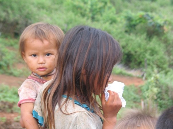 Back on the road we endured a steep climb up the hillside, pausing at the top in a lean-to where we could sit and let the wind hit us, dripping sweat from the heat and humidity. Along the way into the next village, we passed numerous slopes that had been cleared in the slash-and-burn method, which Pen assured us were to be used for rice cultivation, though they seemed only to grow shrubbery and low brush, and farming land was scant. We got into the village early afternoon, after about six hours of hiking, coming first upon the three-room school with dirt floors. The children were running amok outside, watching us warily and later warming up as we showed them the neat things our cameras could do.