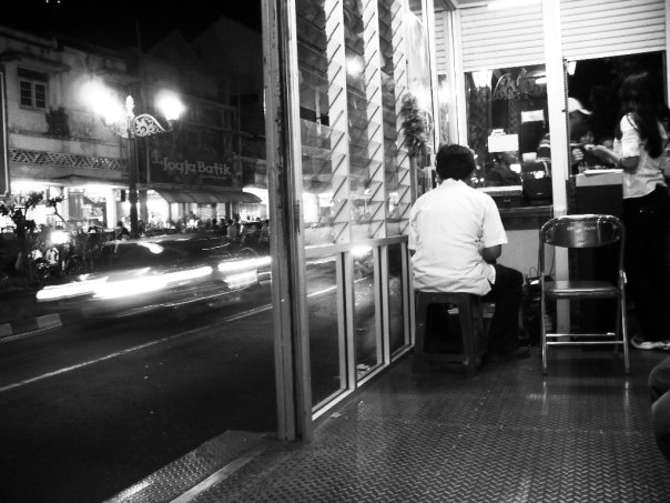 With my legs shot and the town thoroughly explored, I left that night on the long bus to Jogjakarta.  Eight hours on a bus makes for a long time, particularly when said bus has only 36 official seats but 45 or so passengers.  Nobody is turned away so long as a profit is to be made.  Basic, simple capitalism at work here.  Jogja is one of the main cultural hubs of Indonesia, a smallish city of students and tourism.  Like other southeast Asian cities, it features its very own backpacker ghetto where I’ve seen more white faces in a few days then in the past few months.  I’ve dedicated myself to simply wandering the city, enjoying the sights and, more importantly, the food.  In some cases this means eating donuts, fantastic donuts like thai iced tea flavored.  In a more culinary sense, it means eating high-quality Indonesian fare, which is just a tad spicy and generally quite good as long as they don’t short you on the ingredients.