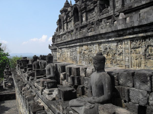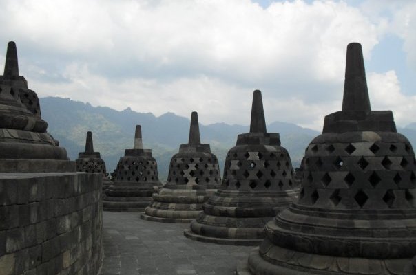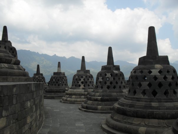 The visit to Borobudur was about as expected, with crowds and heat that have long become a trait of any of the ‘must see’ places in Asia. The setting itself was lovely, based near the foot of some jagged volcanoes that reached up into the clear sky. All around was the expansive view of jungle and greenery vivid in the humidity. The temple itself was certainly large, though the structure, again, fails to match up with the scale or grandeur of the temples at Angkor. Nevertheless, it was interesting.