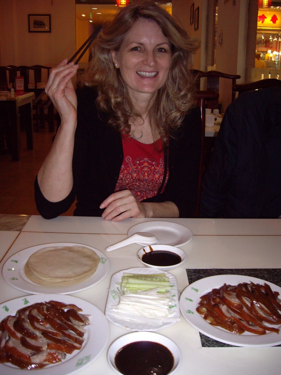 We were both starving by now so we headed out for Peking Duck. Yummy!! I now know how to eat Peking Duck. After the chef carves, (being sure to get some crackly skin on each slice) it is presented at your table with some super thin pancakes, thinly sliced scallions, thin cucumber sticks and really tasty plum sauce. So, you roll all of the ingredients up in the pancake like a burrito and dip into the sauce. Really loved it! They take the pieces of duck that aren’t carved, (the parts with bones) and deep fry them. Zak says you eat these pieces and spit the bones on the table . Did not try this.