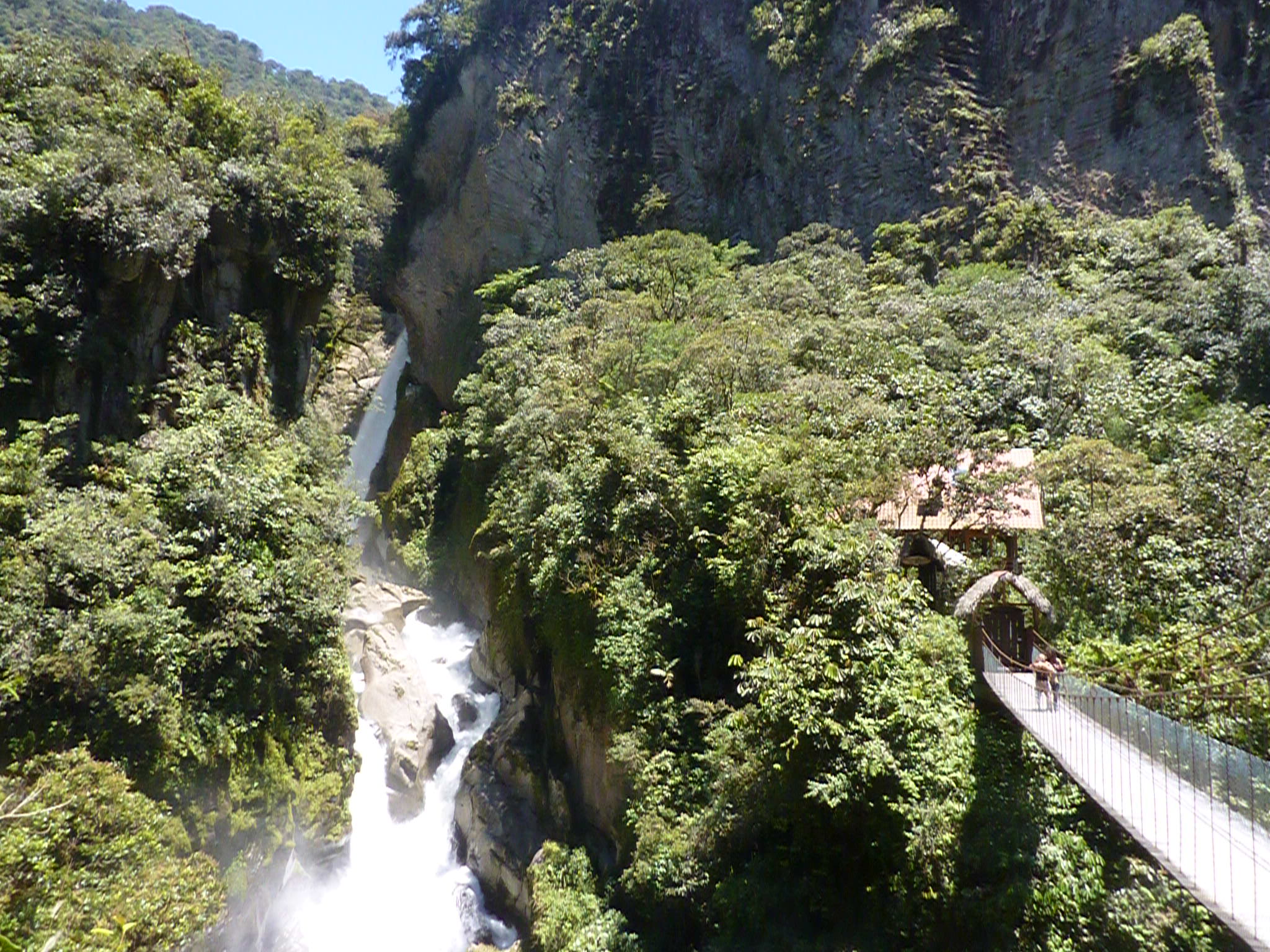 However, the clouds lifted (literally) on the third day and the weather was so nice that I had to postpone my planned departure for Tena and rent a bike.  I wasn’t thorough in checking the bike out before leaving for the 20km ride and found to my chagrin I was going to get an extra workout with the headwind and the back brake hugging tightly to the tire. Nevertheless, the road follows a winding path down the mountains past numerous waterfalls.  I stopped at the last major one, the Pailon del Diablo.