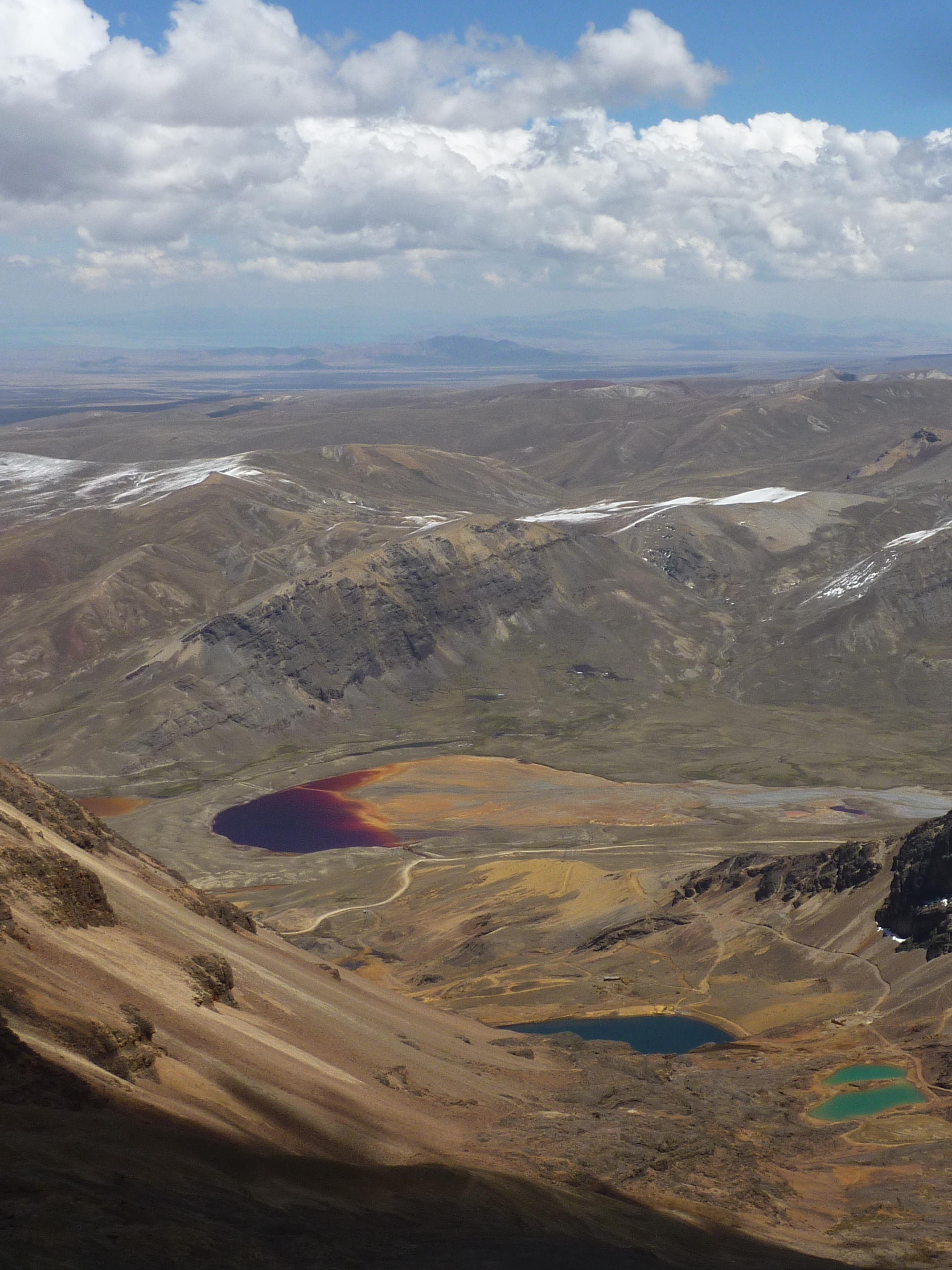The view at the peak, all 5395 metres of it, was stunning. I´ve never in my life been that high without being safely enclosed in an aircraft, and may never be again. Around those of us at the peak were the snowcapped Andes, some with peaks yet taller, framed in sharp white of snow against a blue sky with clouds seemingly low enough to reach out and touch. Below were a number of small lakes, stained different shades from the surrounding runoffs of the mineral-rich mountains. There was no life, no ground animals, not even traces of vegetation at this height. The only reminders of the rest of the world was the smoggy crater that La Paz sits in and the lone Andean condor soaring overhead.