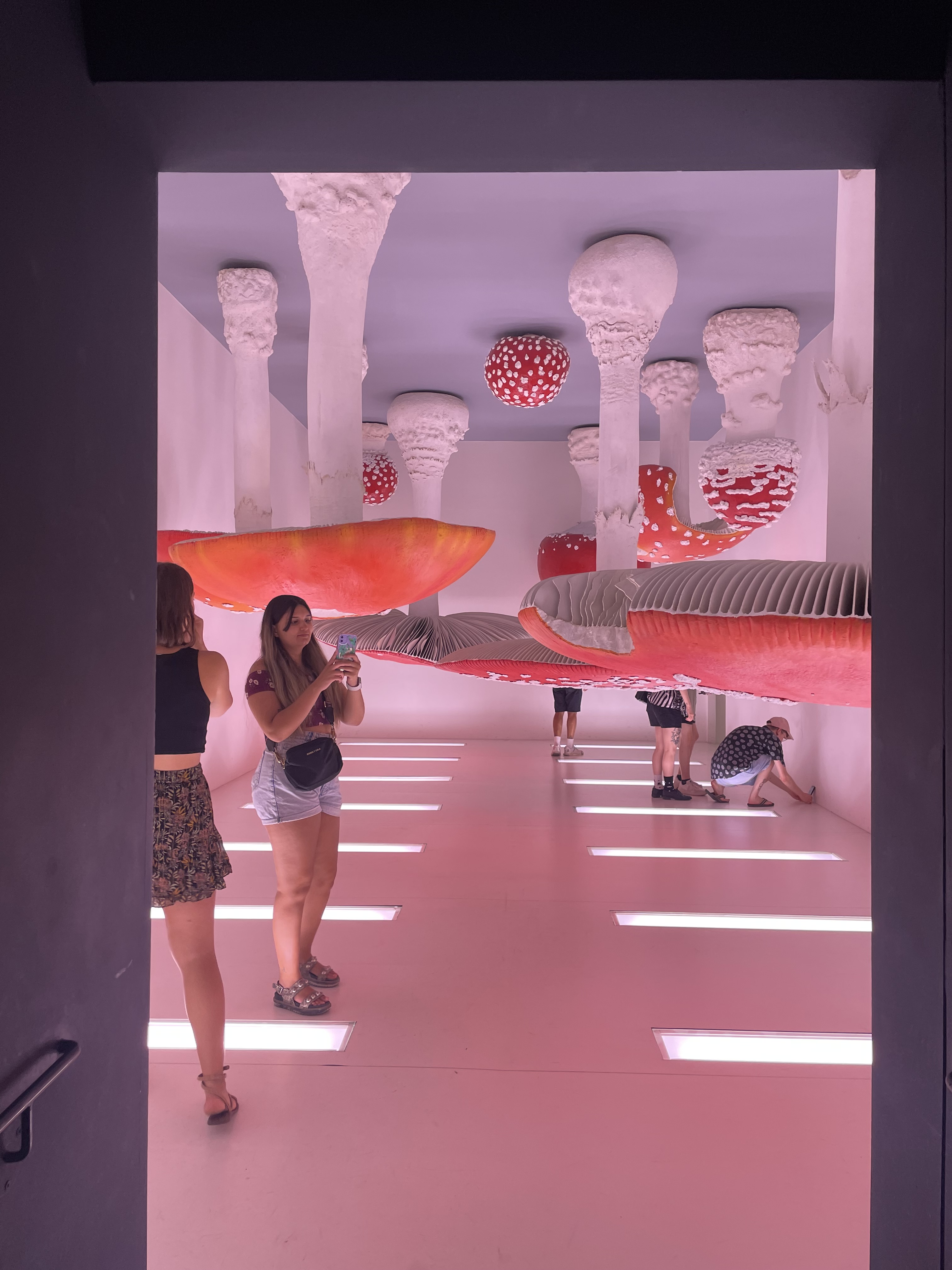 While not the most creative start, we recreated the morning walk, espresso and brioche stop on our way to another art space on day two. Sometimes you find a system that works and it makes little sense to change it, though this particular walk was (for me) enlivened by walking past a trolley depot, with a tantalizing display of the various yellow trolleys poised like forbidden toys beyond the ‘do not enter’ sign. Thus fortified, we arrived at Fondazione Prada, a former distillery converted to contemporary art campus by Rem Koolhas (see also Seattle Central Library for a more local example of his firm’s work). We waited far too long to get tickets, with the group in front of us needing well over five minutes alone, per my phone’s stopwatch function. Once inside, the rotating collection of works span a whole variety of concepts, the main consistency being the use of the excess scale within the oversized brick buildings. One work that resonated to me was an empty cubicle farm, each desktop marked with small personal items, speaking to connection and the disconnects of aspects of modern work, especially through the course of the pandemic. Much of the work is spectacle, well suited for an age of selfies and influencers, a minefield of politely pausing while others frame up their exquisite takes for social media. I was ready for a break after a few dozen rounds of this.