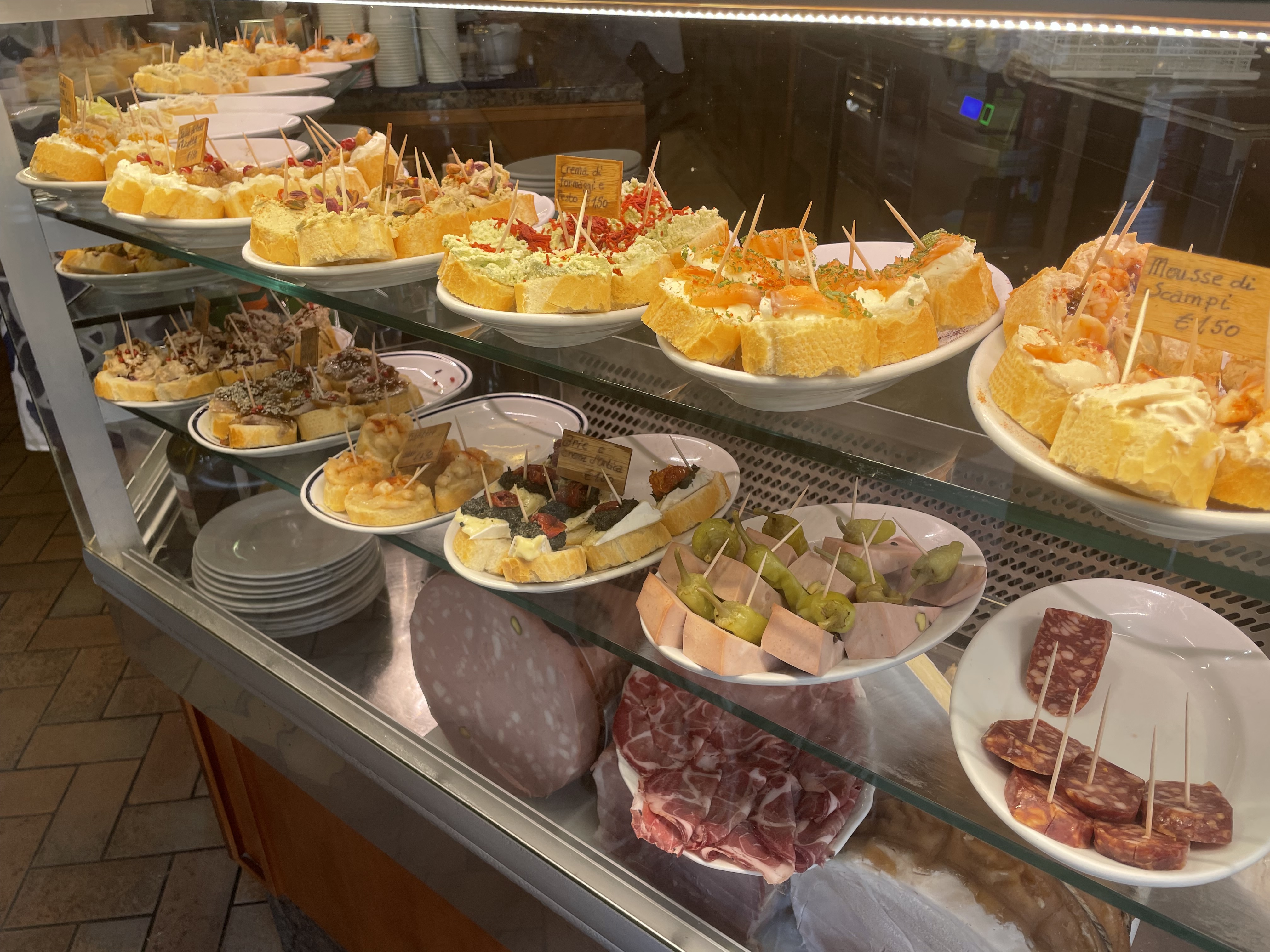 My newfound appreciation of Tintoretto was a case study of Venice on the whole, a place where putting in some effort and doing some of the work can be richly rewarded. It is easy and usually quite enjoyable to grab the first table at a cafe, settle in with a spritz (aperol or campari, depending on the mood) and people watch while waiting for a panini or pizza to arrive. The food, while not spectacular, is solid and this worked fine for lazy meals where we just needed a break. One of our best meals of the trip however was at a small osteria, tucked down the back alleys at the edge of well-travelled San Marco. This was a tip from a friend who had been and it met with the rule of thumb an Italian friend gave us earlier about picking restaurants: look for places with no pictures and no English on the menus, which turned out to be a time-consuming challenge. Nested in at our table, we whet our appetite with a burrata starter before splitting off to our separate plates of a clam and mussels linguine for Hannah and a gnocchi ragu for me. Absolutely heavenly, and all the better in the boisterous, intimate wood-paneled dining room. We left after closing time, with the owner treating us to a limoncello shot as we paid our bill. This hit was followed the next day by more culinary good fortune, a chance encounter with a lunch time taverna, similarly wood-paneled but chock a block with wine bottles and cicchetti, the Venetian answer to tapas. We made our best guesses, pointing at different cicchetti from the cabinet before enjoying them with a glass of white wine. Sometimes its better to be lucky than good, I thought as I munched on my last one, a creamy gorgonzola topped with a walnut.