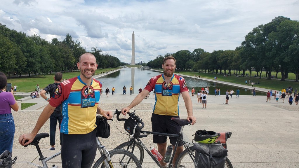 We wound down the trail to the National Mall, periodically consulting my phone to be sure we took the right turns, desperately trying to avoid any unnecessary distance after five days in the saddle. The sky was full of clouds, white and cottony, but without a trace of the promised rain. The space between the Lincoln Memorial and the reflecting pool was swarmed with people, and one was kind enough to take our picture at the end of the trail. There was no rush of euphoria for me at finishing this ride, I think I was too tired at that point and a bit preoccupied with the process of returning our bikes. In truth too, I was a bit sad for the ride to end. There was something to the rhythm of the days on the trail, the simplicity of going from place to place, and the satisfaction of doing it yourself that I really loved. I could’ve kept going, but we had run out of both trail and time.