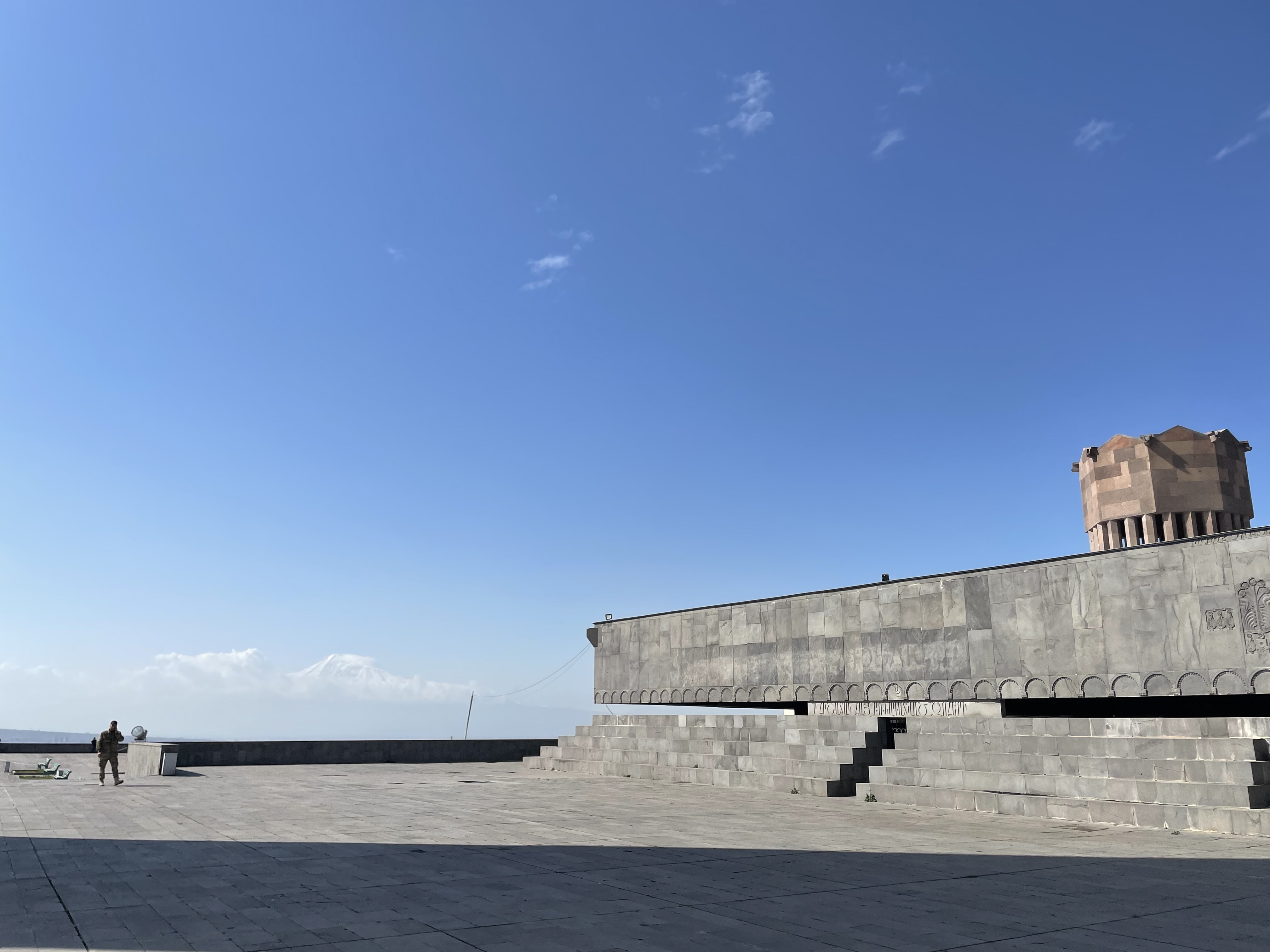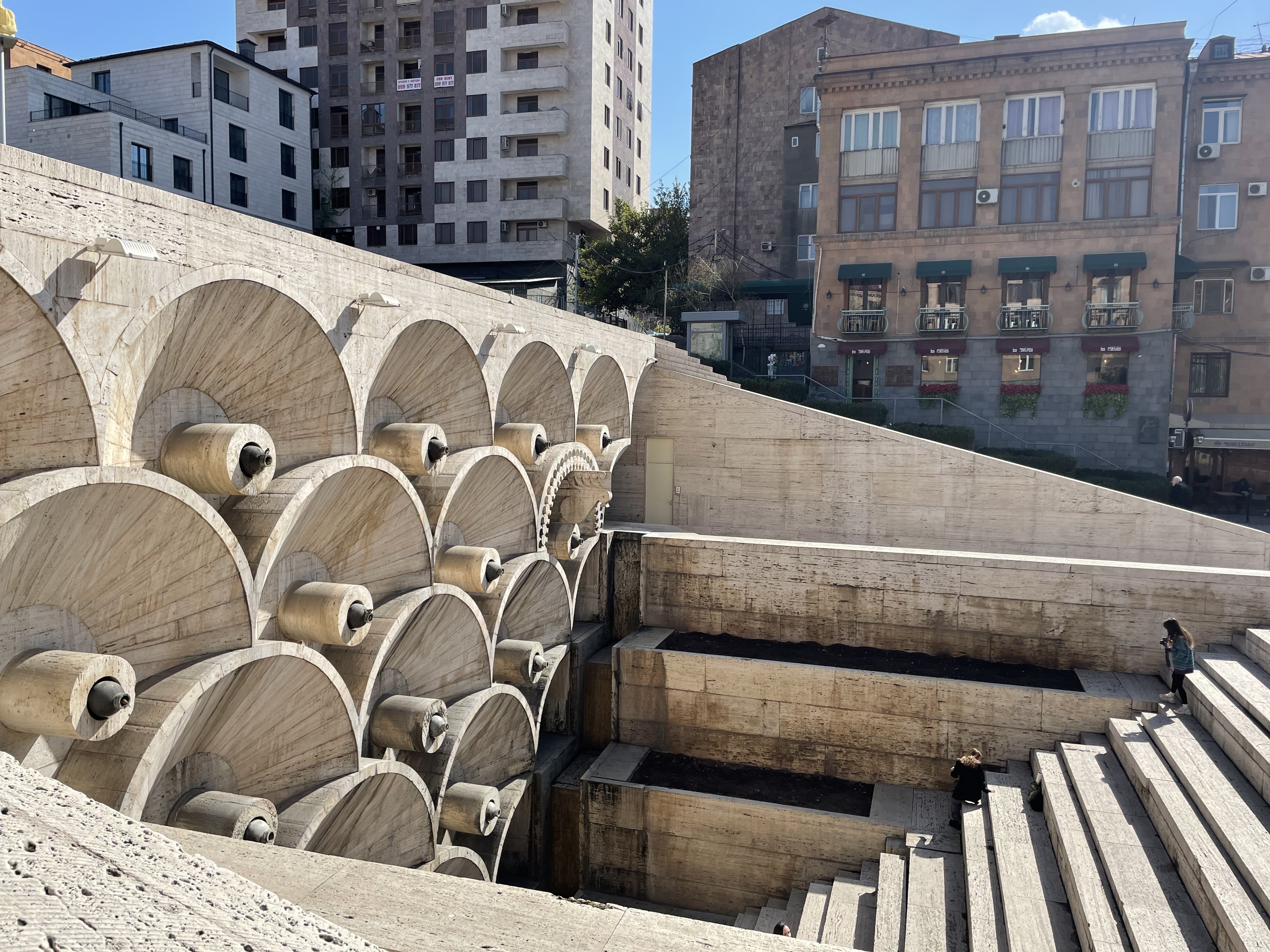 Each terrace takes you higher above the city, and evidently there are meant to be fountains which sadly are off for the time being. Nevertheless, the Cascade makes for a breathtaking centerpiece of Yerevan, blurring the line between building and public art; a climbable sculpture. Beyond the highest tier is a patch of land full of rusting rebar and broken concrete footings, the halted next and final phase of the Cascade. Farther beyond that, you can climb to a 1960s Soviet monument, all grey stone and windswept open space, celebrating the 50th anniversary of the October Revolution. The path between the two monuments is somewhat convoluted, with a clear missing piece, and I made my way back down the Cascade to a terraced café for tea and brunch while I contemplated the overt symbolism of the remaining unfinished this gap between Soviet and modern Armenia.