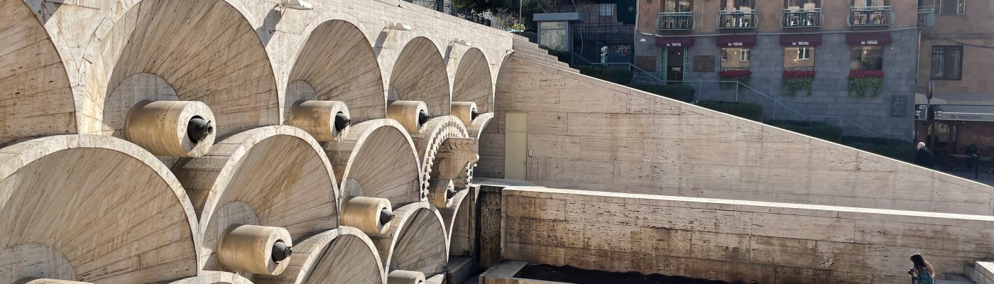 Depositing my bag and completing registration pleasantries at the hotel, I took to wandering the streets, an activity I strongly feel should be every traveler’s first act in a new place. By late morning Yerevan had roared to life, cars either racing between traffic lights or caught in inexplicable congestion. I made my way to a few spots on my list, the first being the old Soviet Chess House at the edge of the ring road. On poking my nose in the open door, I could see a teasing mosaic corner but before I could get any farther, a security guard spoke to me. While I didn’t understand him, the point was clear and I turned around. Next stop was the Cascade, and here nobody appeared to bar my entry. Begun in 1971 and completed in phases over several decades, the Cascade is an elongated vertical building and garden stepping up a hillside in Yerevan. It has the same cream-coloured stone as so much of the city, but bears a style of hard-edged geometric forms, with a few figurative elements tossed in for good measure.
