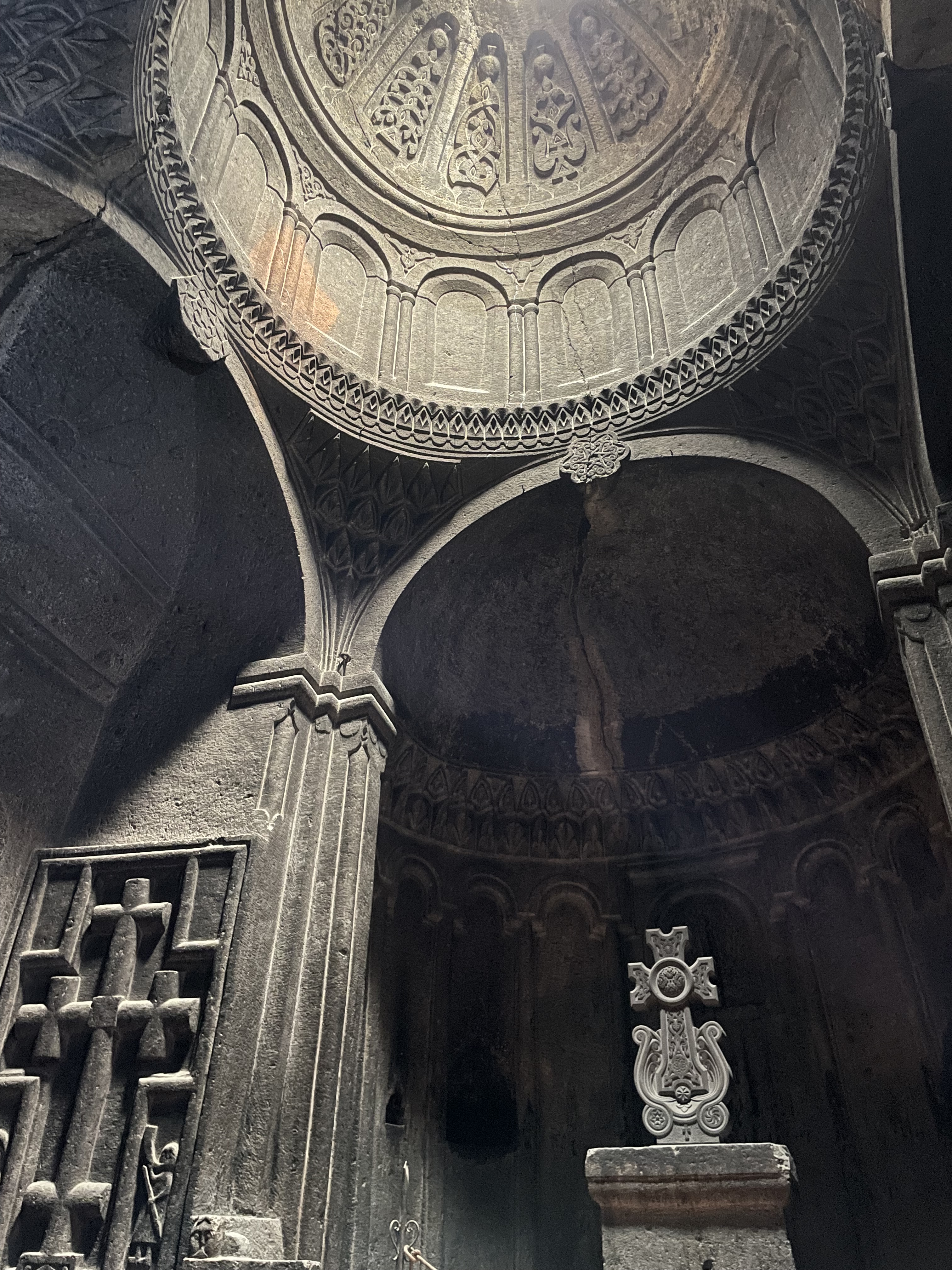 From here it was onward to Geghard, a monastery complex nestled into a valley at the literal end of the road. Here history has been kinder, and the complex largely seems to be in its original form, several dark stone churches infused with burning candles, the scent of smoke and wax offering mysticism to the solemn interiors. Portions of the churches on site were carved straight out of a single rock, a painstaking endeavour with hand tools that made the final results all the more impressive. No frescoes or mosaics cover the walls in Armenian churches, they take a more stark approach to decor, though here there were graceful reliefs sculpted into the rockfaces. One of the rooms was noted for its acoustics, which was demonstrated by a competing tour guide busting out a soft hymnal song in the space. Her voice, which was good anyway, carried through the room and everyone hushed to (mostly) appreciate the moment. Post Geghard was lunch, a long table affair at a restaurant whose overextended staff weren’t able to get the food out before it got cold. You roll the dice on these tours.