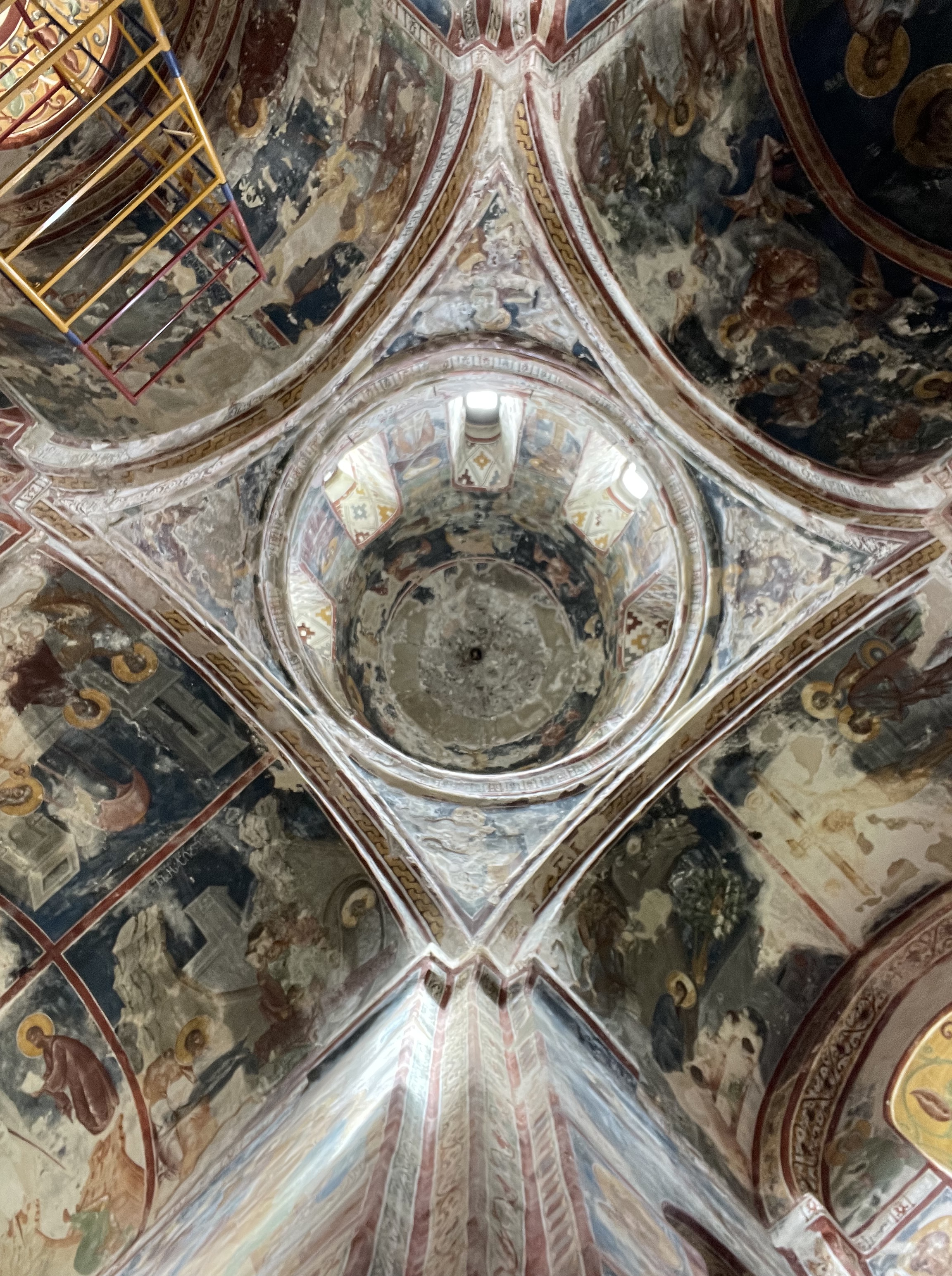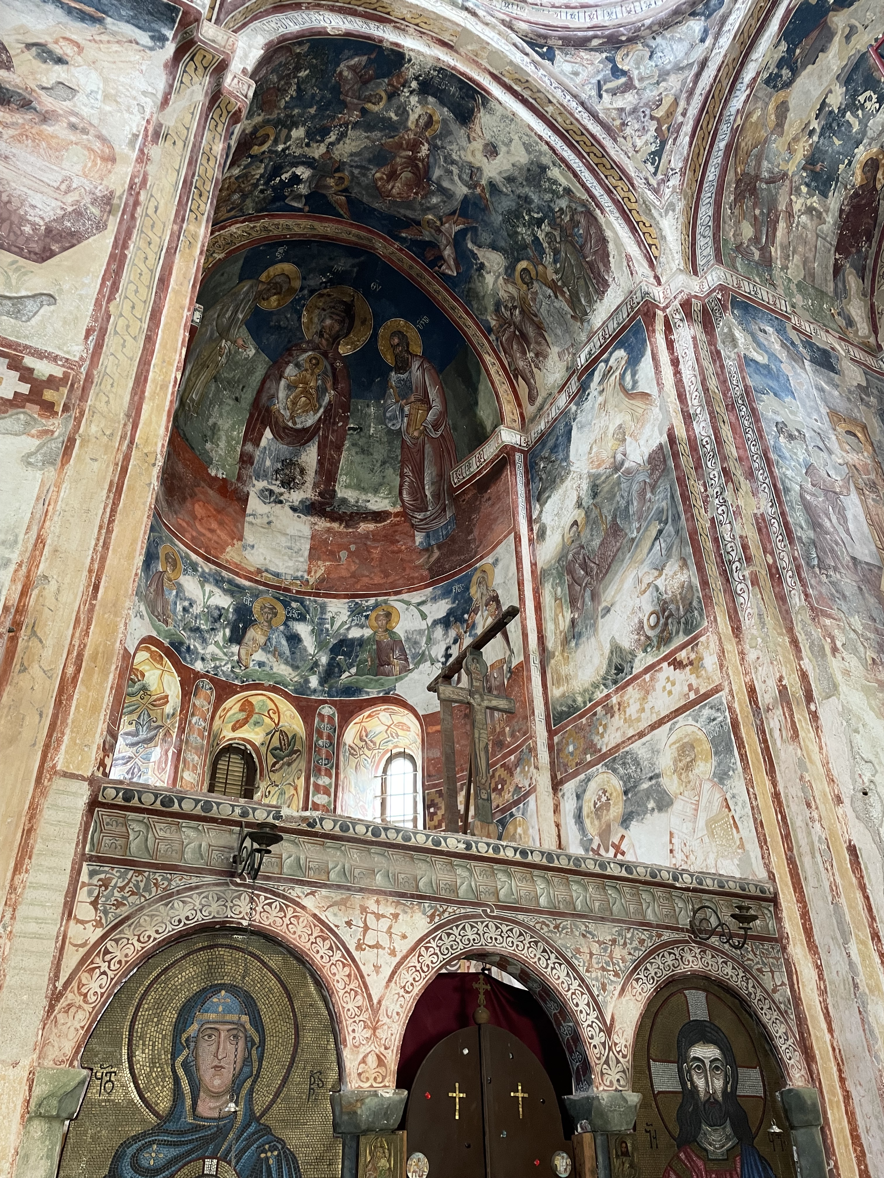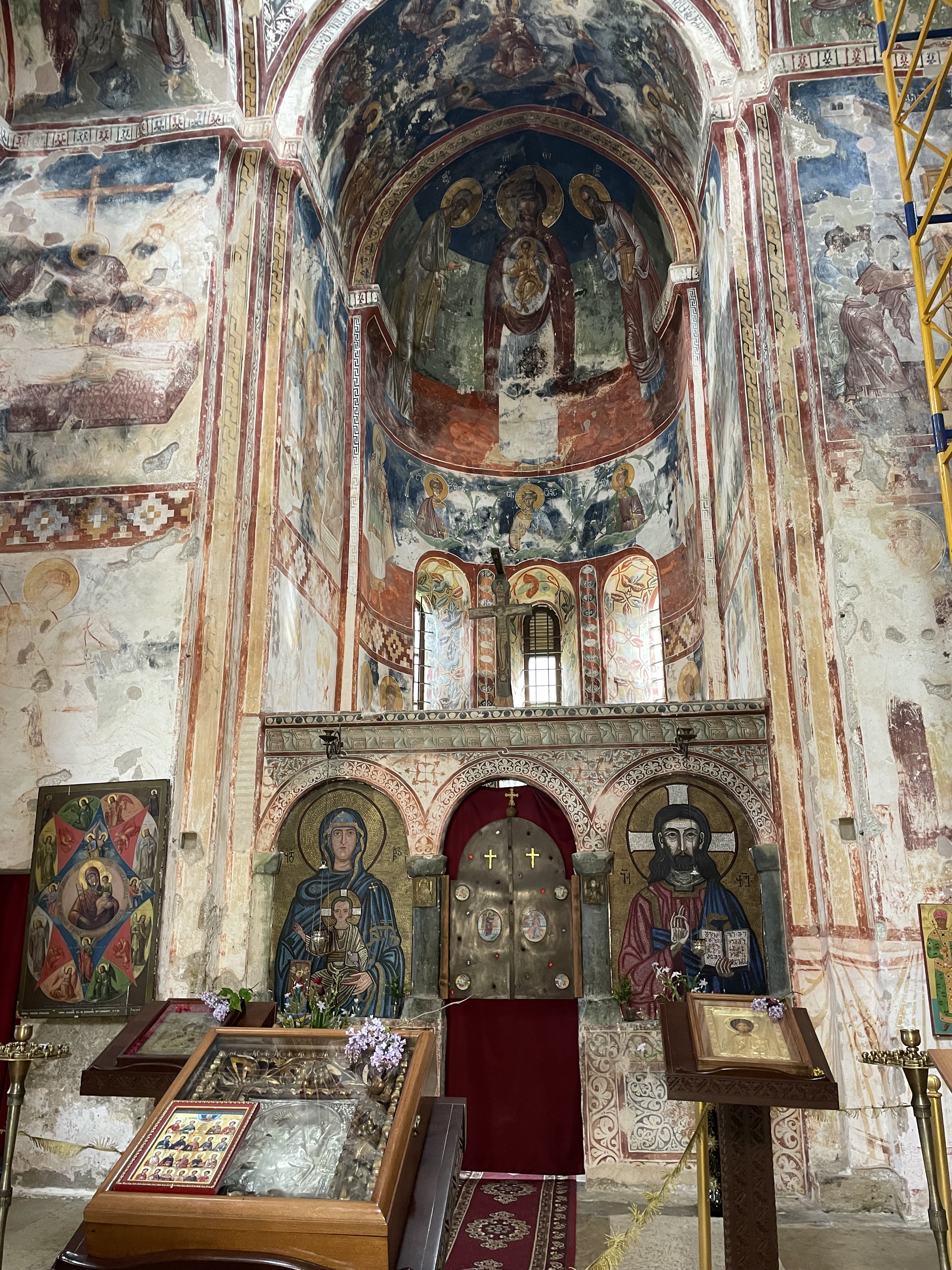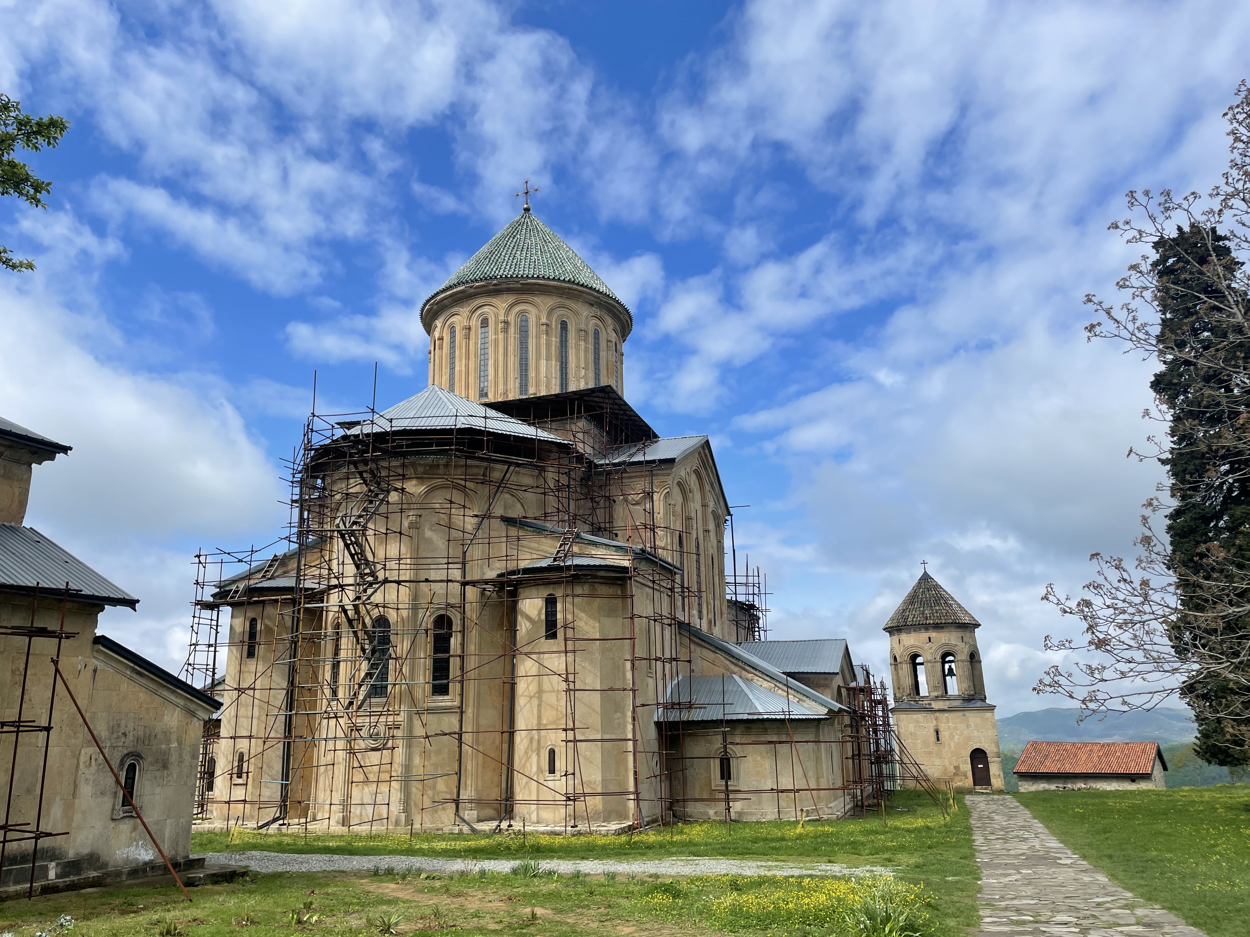 Farther down the road, and as always situated in a commanding location, the larger and more renowned Gelati Monastery complex awaited. Gelati is a big one, and again here the main church was filled with chanting monks, burning incense and candles, and…scaffolding. The central nave was a web of metal, encasing every wall. The goal, apparently, was a wholesale restoration of the fading frescoes, though the contrast between the new and old ones made me wish they’d just leave it alone. At a smaller church on the site, so far untouched by this impulse, there was no scaffolding, just centuries-old faded frescoes. Nearby, at the former main gate to the monastery, was the massive funereal stone and marker for King David, the Builder. He is the father of the aforementioned Golden Age of the country, and it seemed a fitting cap to my time in this land to see his resting place.
