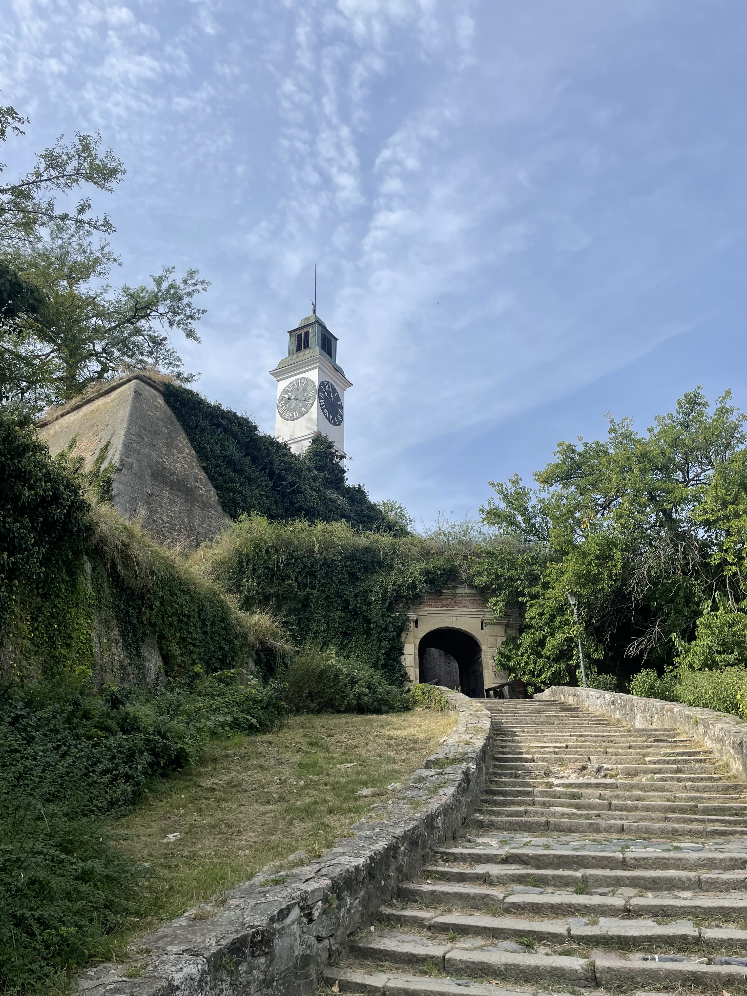 The main draw is not actually in Novi Sad at all, but instead a short walk across the river and a short hike up a steep hill. Petrovaradin Fortress sits atop a small cliff overlooking a bend in the Danube, a recurring theme for placing Balkan fortresses. Exposition, where the museum excelled, is almost totally absent here but the basic visual cues of gates, ditches, walls and ramparts are consistent enough to follow while walking the site. Alcoves at the base of some of the castle buildings sell art and tchotchkes, but it is a soft sell and one man preferred to prioritize feeding a pigeon flock over pitching any of his work. The heat was coming on strong towards midday, the worse for lack of trees and shade, and when a horde of field trip teenagers (the boys almost universally sporting a Nikola Jokic haircut) loudly made their way up through the fortress gate, I took the opportunity for a strategic retreat back across the river.