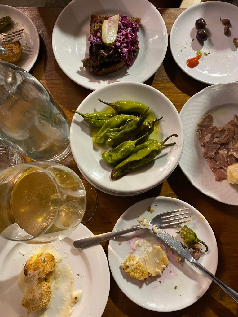 In between people arriving and circulating, staff snuck away empty plates or, to much greater fanfare, appeared with more appetizer plates. Bottles of natural wine marked distances down the length of the table, doubling as social lubricant and introductory device as one person reaches past another to make a pour or asks how it is. I can vouch that the wines, for whatever my palate is worth, were excellent. The evening was also a chance for me to reunite with some high school friends and meet their partners, which was an absolute highlight of the wedding days. The party showed no signs of stopping when we stepped away, exhausted. I could not begin to match the gusto of the groom’s older uncle, a short and robust Sicilian who took to an impromptu operetta dedicated to the bride. When in Rome and all.