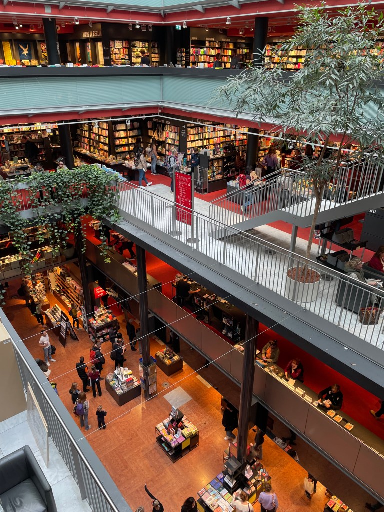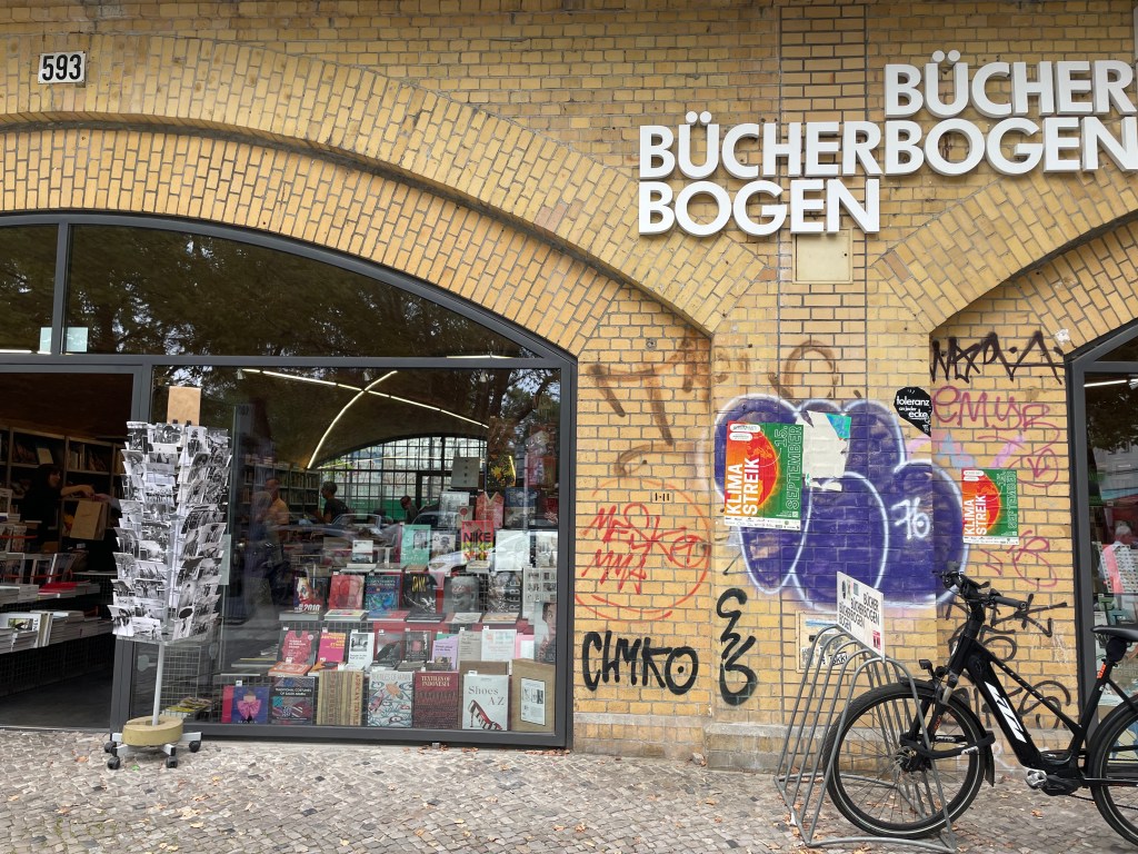 Expansiveness is part of Berlin’s appeal. Long, winding streets thread endlessly through neighbourhoods that quietly bleed into one another, a constant invite to keep going. When on the road, Hannah and I often split up for part of the day. This time we parted ways at Berlin Zoo station, Hannah armed with her laundry list of galleries, and me dodging a drizzly sky between bookstores. One, Bucher Bogen, is nestled beneath a series of gently vaulted cream bricks, under the rumble of an S-Bahn, and stuffed with architecture, design and assorted non-fiction. English is uber alles in Berlin, and Germans will switch to it at the first sign of linguistic weakness. When Hannah and I are together, mumbling to each other about a croissant or a cake at a bakery, I get it. We tipped our hand early there. But on my own I’d like to think I have a fighter’s chance of speaking some German and generally I got more benefit of the doubt when solo. This didn’t stop a bookstore cashier at Schoeller Bucherstube from ringing up my German book in English. No mercy.