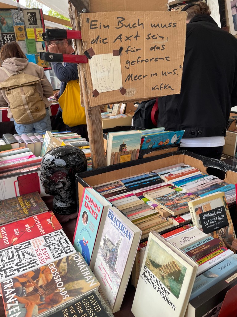 Our last day was typical, starting up with a coffee and pastry before a walk. Our destination was Mauerpark, a greenspace reclaimed from the former no man’s land where the wall once stood. En route we passed by a Spanish tour bus group wandering around a stylized Berlin Wall memorial, cameras in hand. It’s easy enough to take pictures in front of the Colosseum, it seems odd to take one in front of these recent monuments so tinged with tragedy. Onward we went, reaching our destination, the Mauerpark’s sprawling Sunday flea market. I love flea markets, they’re a window into people’s lives, all emptied attics and dusty junk bins laid out and looking for an offer. So much bric-a-brac, a delightfully contained eruption of chaos, table after table. True to my theme, I found a memoir of an East German during the transformative 1990s, my souvenir.