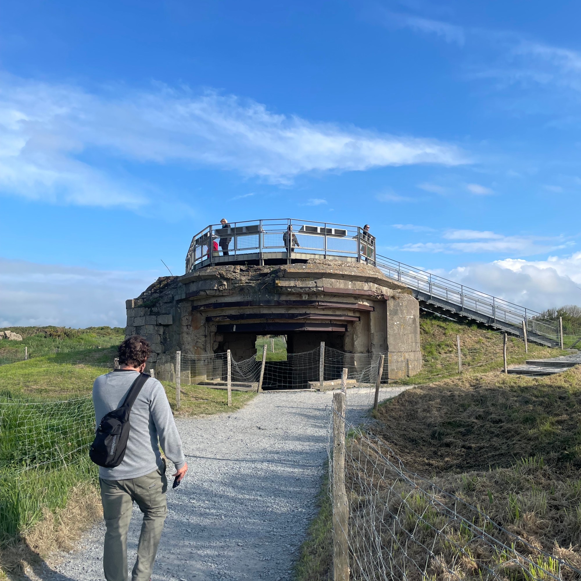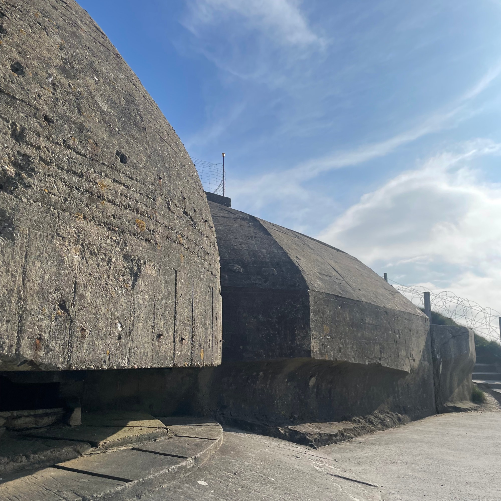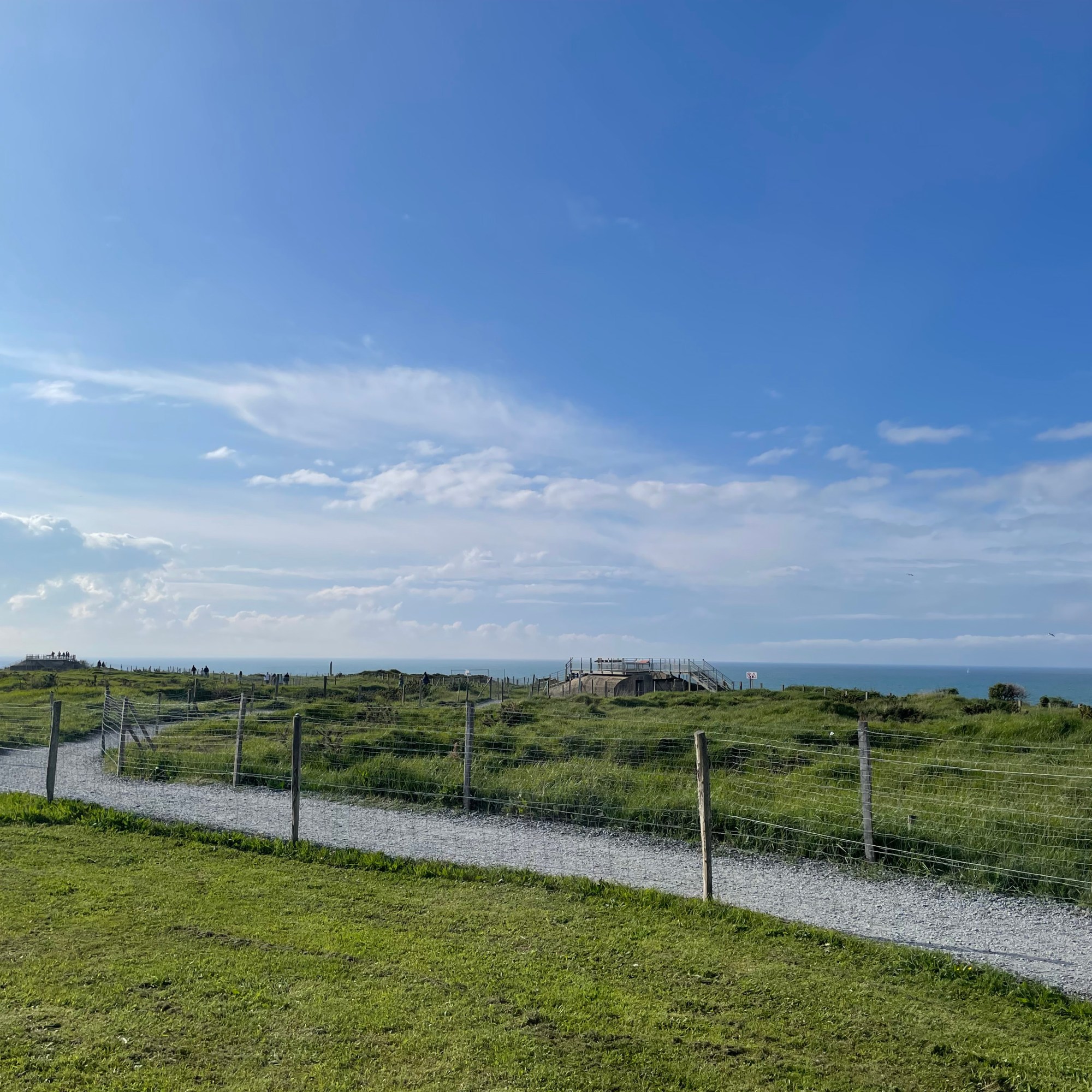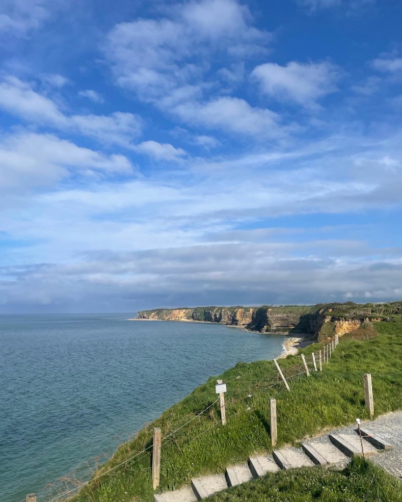 The last big stop we made in Normandy was at Pointe du Hoc. This is a set of sheer cliffs facing the sea, nestled between Omaha and Utah Beaches. It was also an emplacement for German defense measures, with clear sight lines to both beaches. This potential threat was not lost upon those planning Operation Overlord and a Rangers detachment scaled these cliffs on D-Day, fighting inland to disable the guns and eliminate this threat to the troops arriving below. Today it is quiet but the network of bunkers, gun casemates, and pillboxes sit well-preserved under the Norman sun and a light breeze. All around is bird song, cooing doves and magpies flashing by, and it’s almost possible to forget what happened 80 years ago.