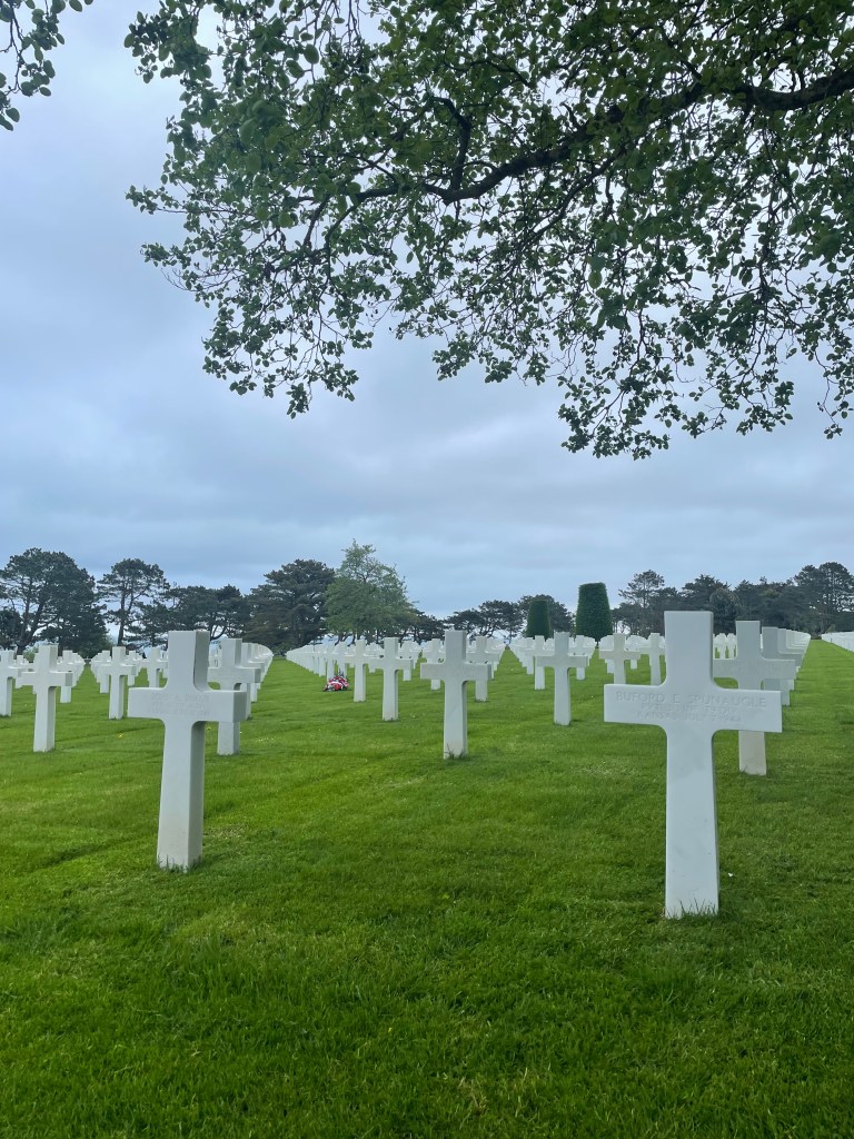 Among the American beaches, we picked Omaha over Utah. Landings at Utah Beach had been pushed off course by weather, ultimately resulting in an easier landing with relatively few casualties. Omaha Beach was the opposite, with soldiers arriving on target and directly into the teeth of German defenses, exposed over up to 400 yards of open sand. The American sacrifices on this day, and those to follow in the Battle for Normandy, which raged for months, are on stark display at the American Cemetery. It was here too where we really encountered mass tourism, a parking lot crowded with tour buses, shuttles, and camper vans. Generally people are respectful, and while I can’t quite get behind the hats and jackets being worn to celebrate the landings, everyone I saw treated these spaces with solemnity.