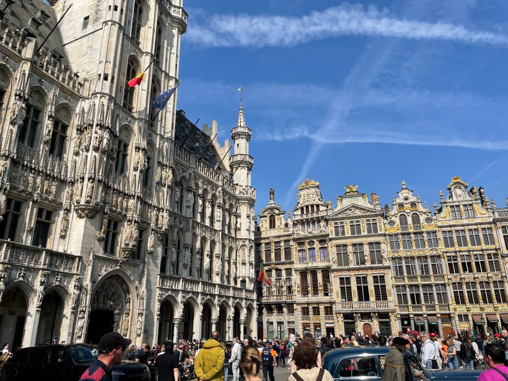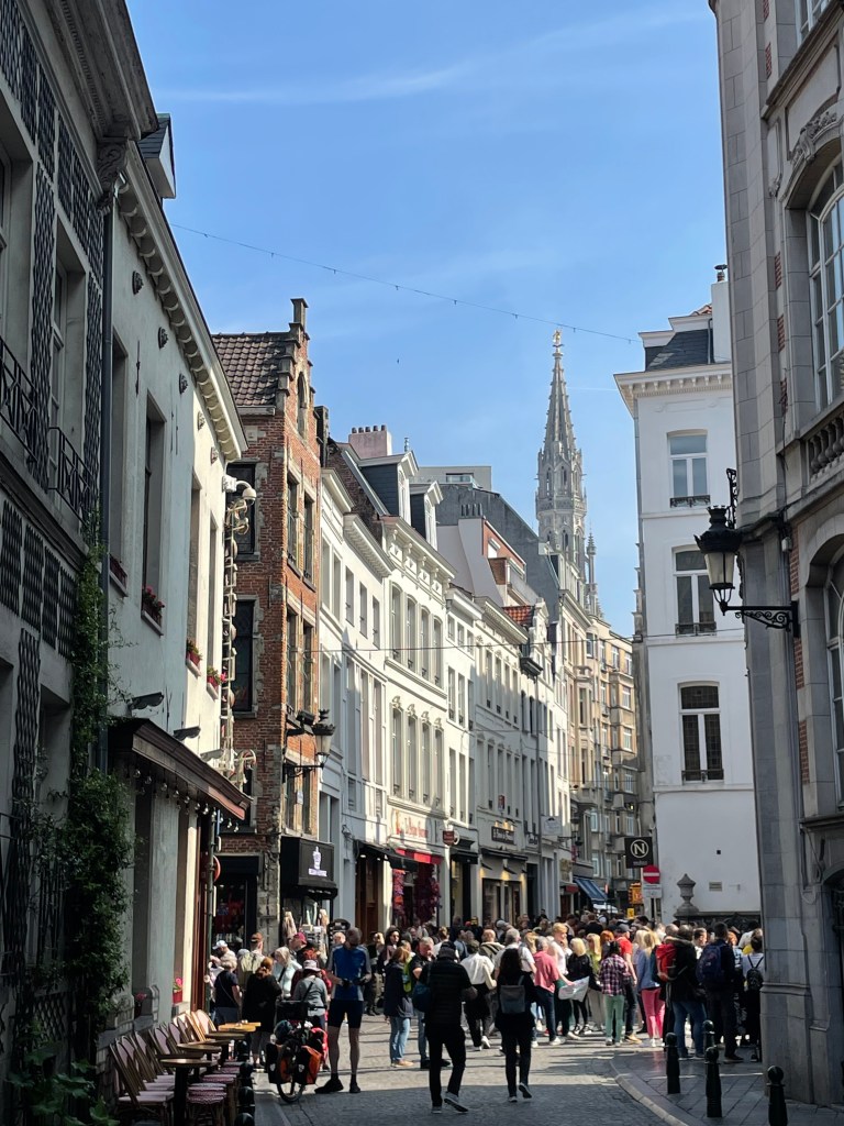 But we pressed on, heading on foot to the centre of town on oddly quiet streets. Rounding a corner, seemingly from nowhere, we happened upon crowds led by flag-toting guides. Here group tourism had clustered around the Manneken Pis, a statue of a little boy peeing into a fountain and a concerning omen for the touristic riches of Brussels. Like our Gastown steam clock, I failed to see the point. A few minutes later, weaving between groups, we arrived at the Grand Marche/Groot Markt, an eruption of cafes ringing a large plaza apparently used for photo ops. Brussels is the bilingual heart of Belgium, where French and Dutch share equal status and English is ubiquitous. The tall, narrow old buildings ringing the market and the winding streets shooting out from it are charming, an abrupt and welcome shift from modern Brussels. There are some Victorian era shopping arcades now busily employed in overcharging for ice creams and coffees, but all of this was not quite enough to sustain more than a day or two of interest.