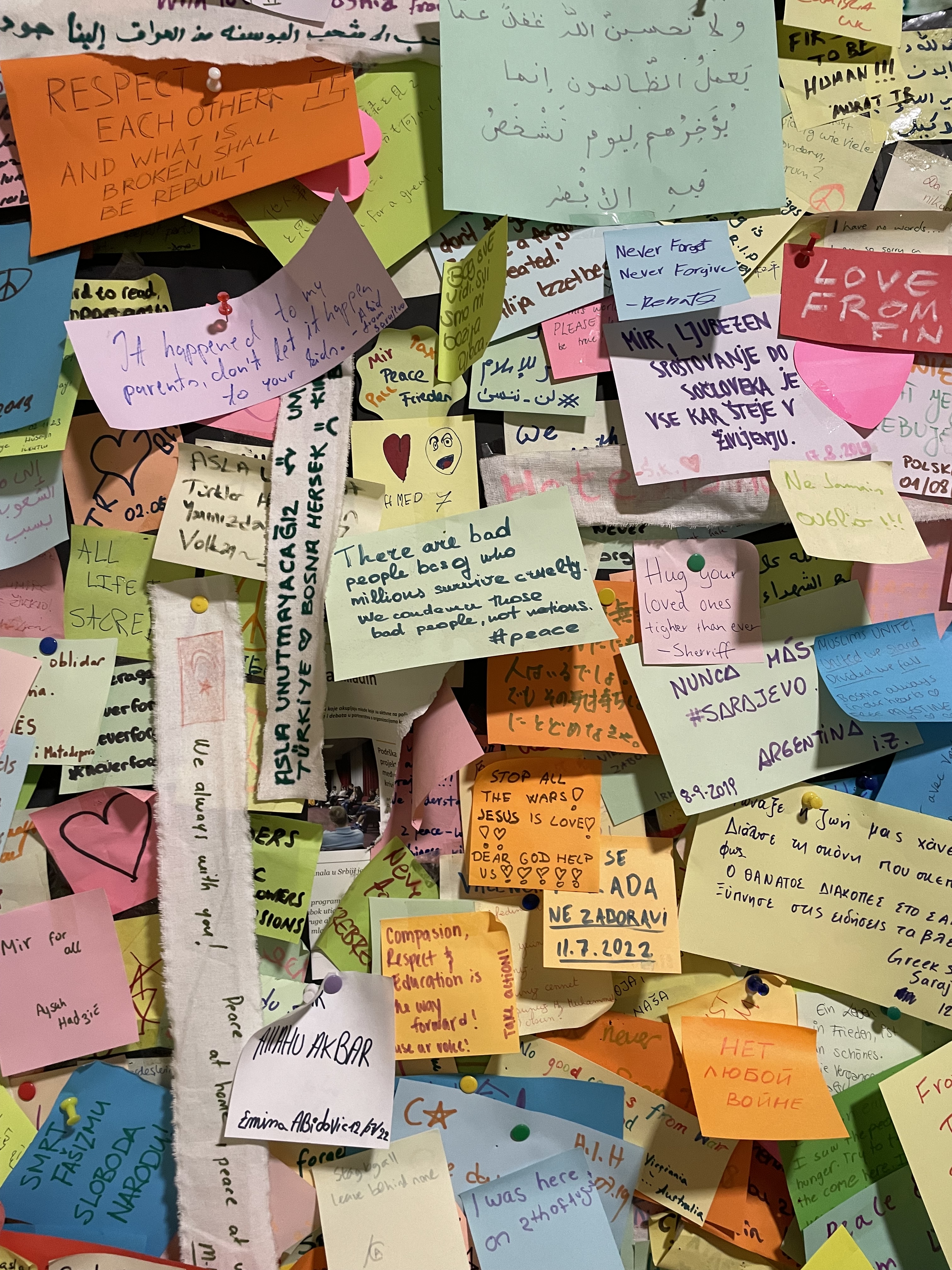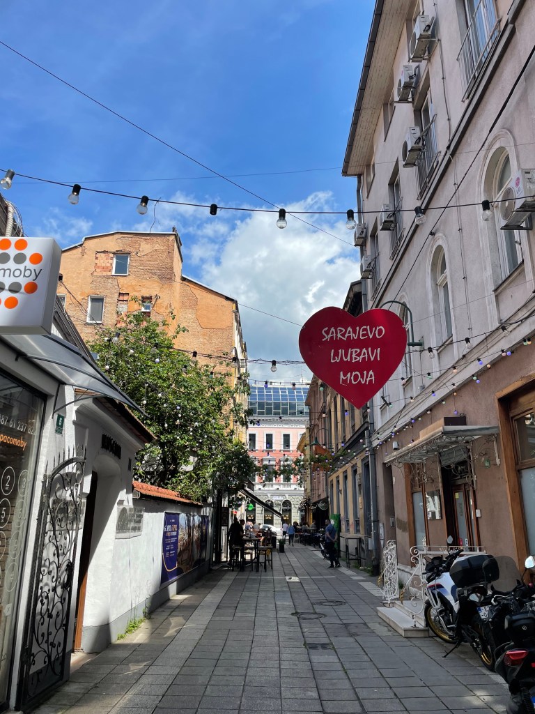 As in France, World War I was hardly the end of war, just the signal of new ways to wage it. There are a half dozen museums scattered around Sarajevo sharing different aspects of the Bosnian War of the 1990s. I visited those dedicated to genocide and the siege of Sarajevo. While the larger arc of the war and the 1425-day siege of Sarajevo by Serbian forces are described, the power is in the individual stories and artifacts left behind. A mother who donated her son’s sweater and fears his bones will not be found before she dies. A boy’s BMX bike, a gift, repurposed to haul water from aid stations. A care package of toys, some the same as those from my own daycare. While walking the street, you will come across the Sarajevo “rose”, red markings on the pavement marking where an artillery shell hit and killed civilians. The first rose I came across was in the Pijaca market, just after buying cherries, where 68 people died. Shells and snipers, set up on the surrounding hillsides, plagued Sarajevo residents. The day left me mired in sadness from these scars, as it should.