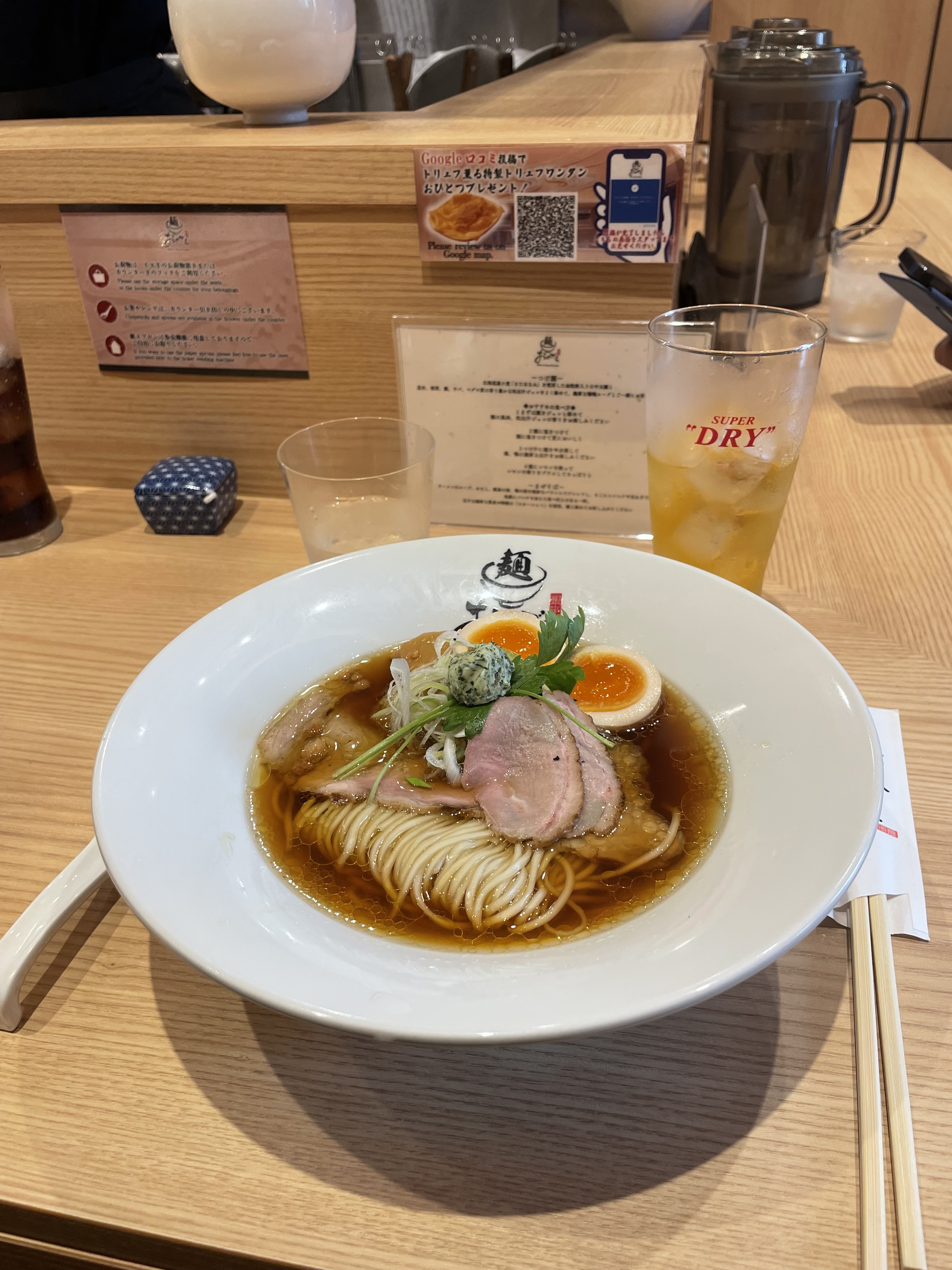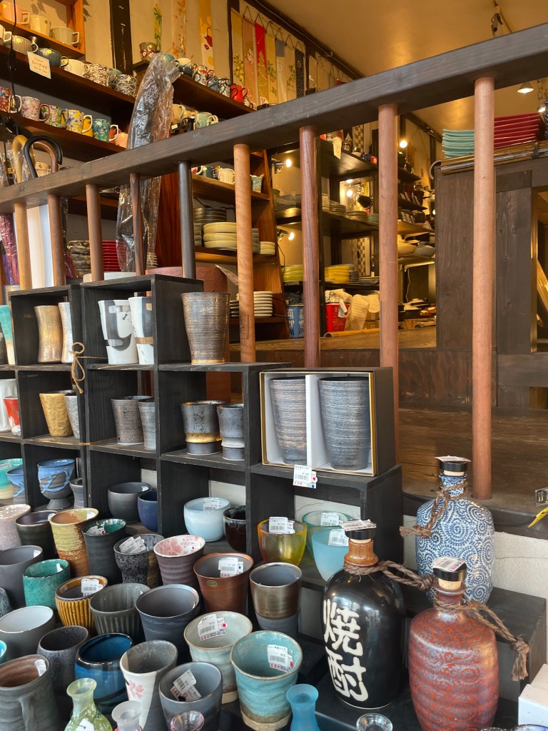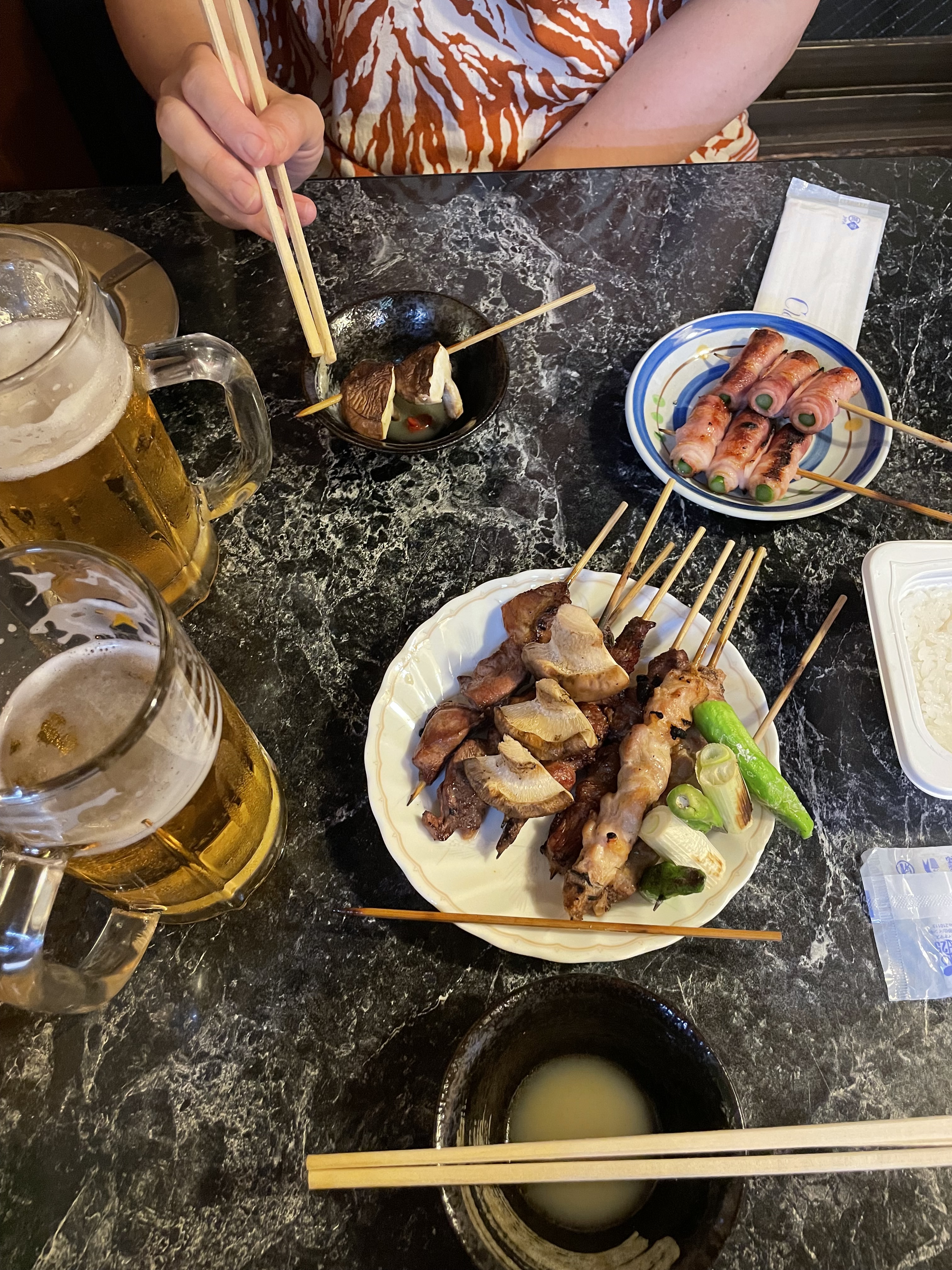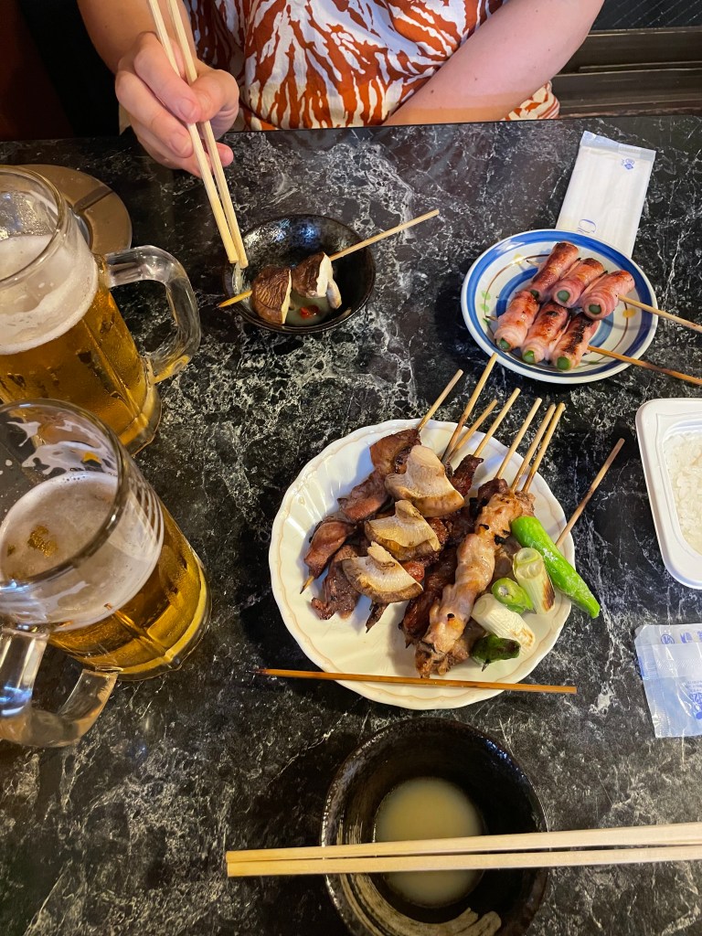 During our Tokyo days we embraced a “go high, go low” policy to choose restaurants and bars. Ground level places often seemed overwhelmed, and we were rewarded for our explorations. Near many train stations, like Shinjuku, are yokocho, small quarters of typically two-storey buildings facing narrow streets, flooded with tiny bars and restaurants, often with no more than ten seats, each catering to its unique niche. The yokocho evolved from the postwar black markets and in ways seem anachronistic, bar hosts hand-chipping ice and shelves groaning with the labeled whiskies of the regulars, though there is also a thriving tourist trade. In Golden Gai, one yokocho, we climbed up a steep staircase more at home on a navy ship before watching our hostess lay out a meticulous platter of small snacks, including cheechiku, a tube of fish with a piece of cheese, to accompany our whiskies. The next night, again upstairs, we worked our way through late-night yakitori, a succession of grilled meat and vegetables on sticks, bolstered with cold beers and boisterous tables of Tokyoites blowing off steam from the workday. The atmosphere reminded me of the streetside shaokao in China, though with more structure and, thankfully, air conditioned.