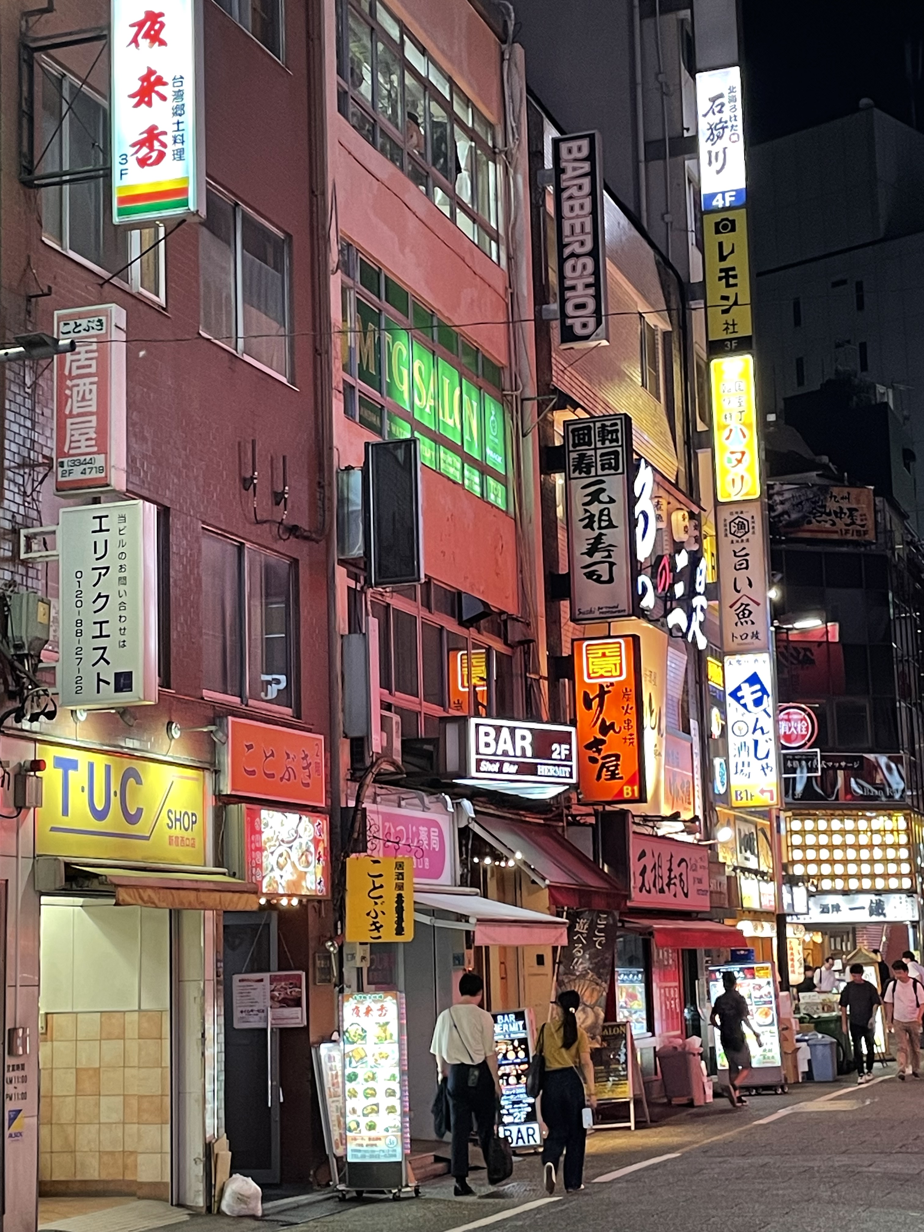Residential neighbourhoods radiate away from the busy train stations and the larger thoroughfares dissolve into a patchwork of narrow and haphazard lanes. There are rarely sidewalks but the closeness of the houses, yard-less boxes discretely marked with potted plants and family names, create a domain dominated by pedestrians and bicycles. Everything is pristine, swept, wiped, and despite the unrelenting August humidity and heat, there is no hint of mold or grime on the polished tiles. Even in Shinjuku, our homebase, where buildings shoot up from the sidewalk in narrow strips of concrete and neon lights, a district of pachinko parlors, capsule toys, restaurants, and bars, the city remains legible. Each building is a private world, each floor offering its own space for its own clientele, all marked out on a blade sign by the front door that can be discerned with patience, confusion giving way to comprehension. This intensely individualized and densely layered landscape keep Tokyo endlessly interesting to walk around.