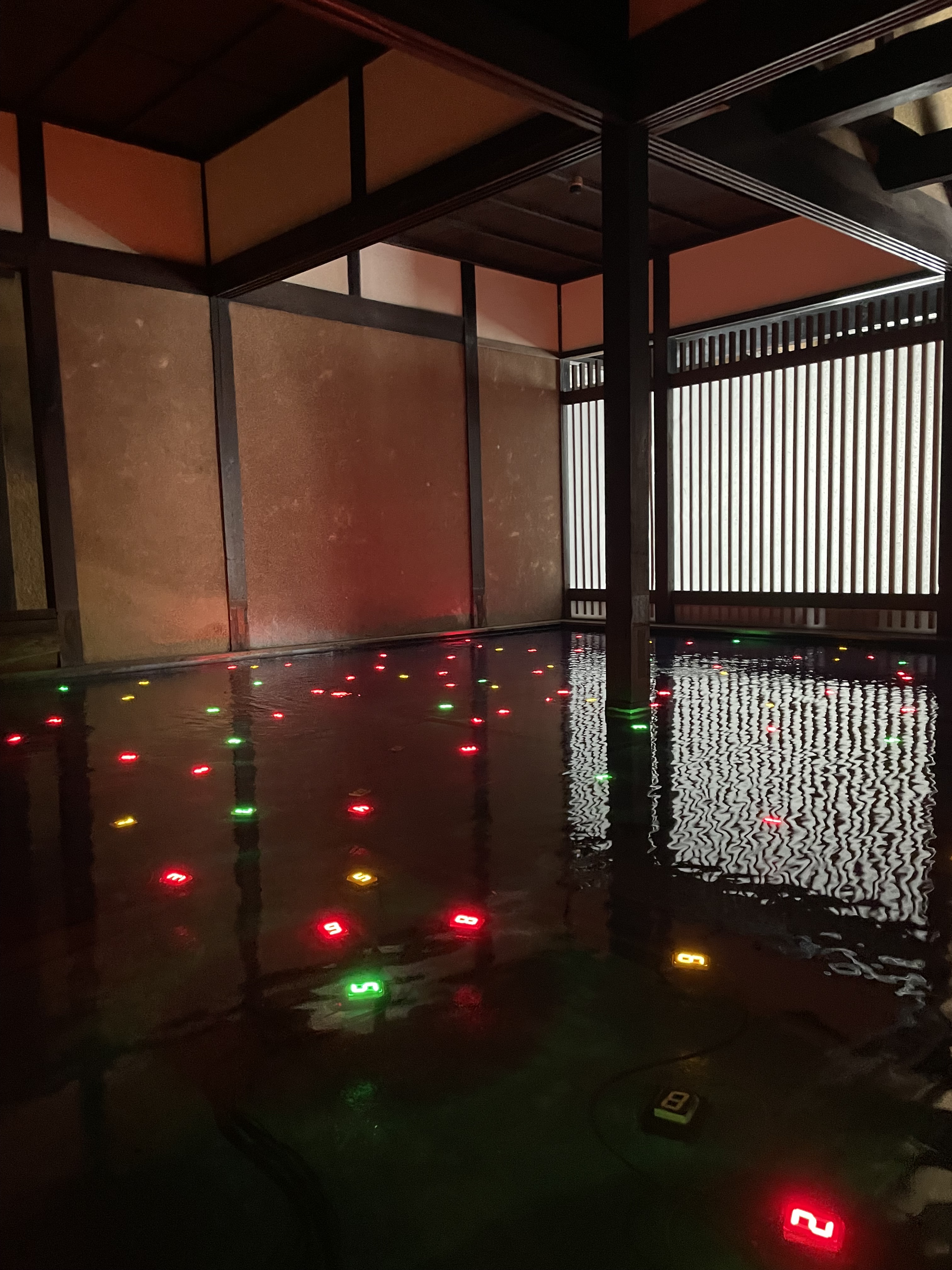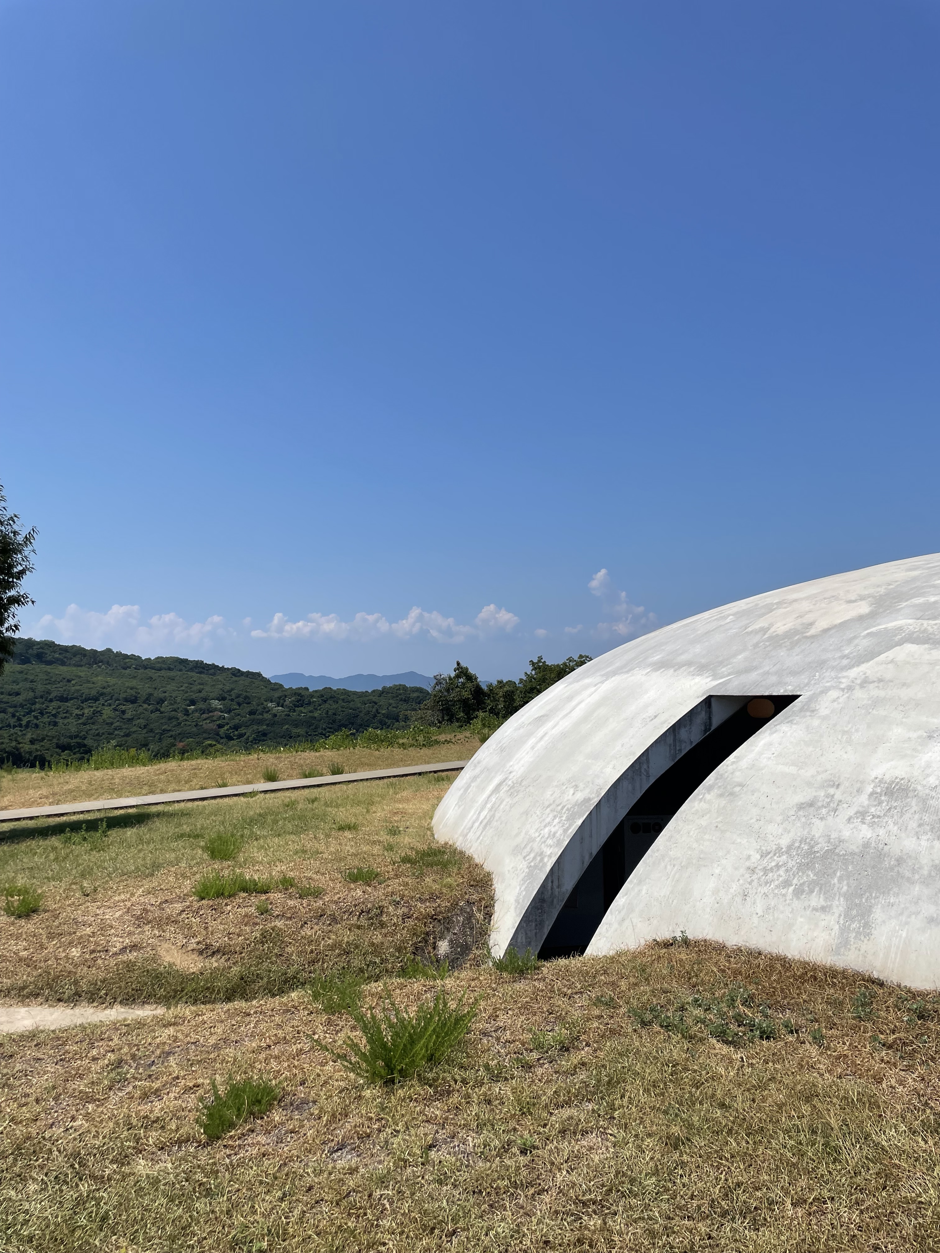 Perhaps my favourite artwork on both islands was Christian Boltanski’s Archives du Coeur. This is tucked in a small concrete structure on the far edge of Teshima, an e-bike journey from the ferry terminal up, over and around the island topography before a brief walk through a stand of trees mirroring a religious pilgrimage. The building sits at the edge of a nameless beach, facing the inland sea and Shikoku. Boltanski’s work is built around nearly 90,000 recordings of heartbeats from around the world, playing one at a time for a minute or so before switching to another. Inside the exhibition, you are in a long, dark hall with a single lightbulb suspended in the middle, brightening in time with the muffled, heavy sound of a heartbeat. It fills the thick air, intimate, almost intrusive, simultaneously unsettling and affirming. Stepping back outside, I sat on a bench, felt my own breathing, watching the breeze ruffle the leaves. Birds sang in the trees and waves lapped over the beach.