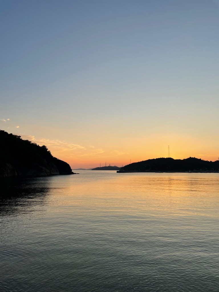 Our last evening was spent close to home, wandering up and over the hills to the Benesse House Museum, the foundational cornerstone to the whole local art scene. Dusk settled over the sea as we made our way past scores of layabout feral cats and signs warning us of wild boars. Overhead, the sea eagles had retired and the skies were alive with the frenetic to-and-fro of bats. Forking off at a guardhouse, Benesse House is at the end of a winding, car-free road. Occasional lampposts cast yellow stepping stones of light, shepherding us around the bend to the starkly illuminated museum. Benesse House is all angled concrete and glass wrapped around a small hill, looking the part of a Stanley Kubrick-directed Bond villain lair, complete with helipad. We had the museum almost to ourselves at this late hour, taking in the sights and making our way home by flashlight. The next day, warm and quiet, we left Naoshima to continue the trip. The island receded in the wake behind us as the ferry pulled us reluctantly back to the real world.