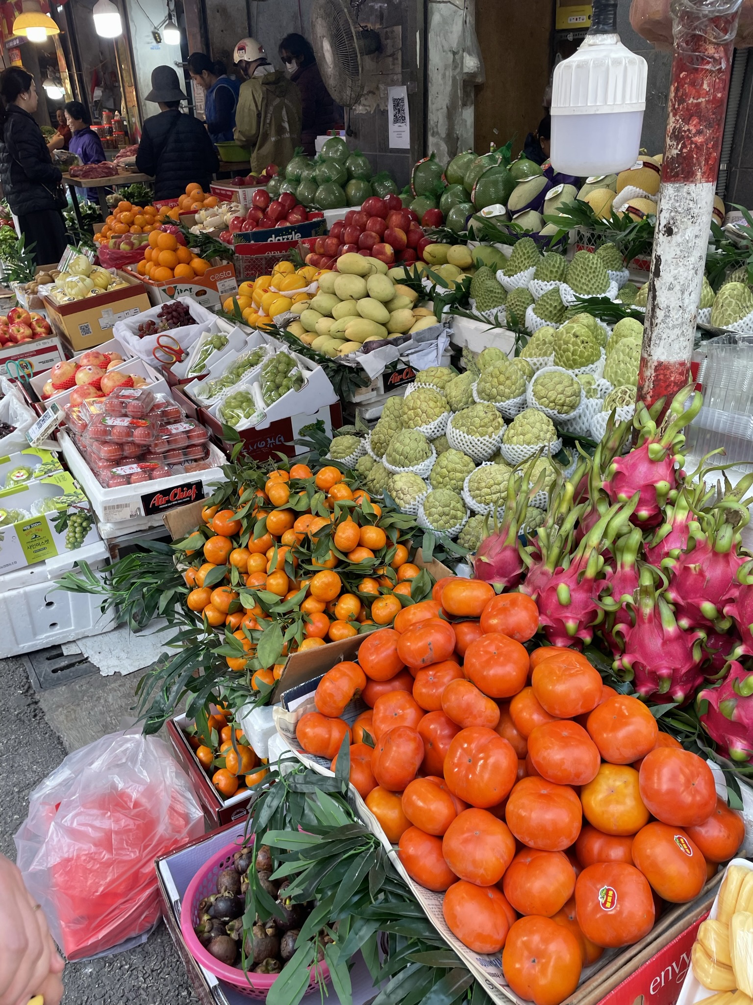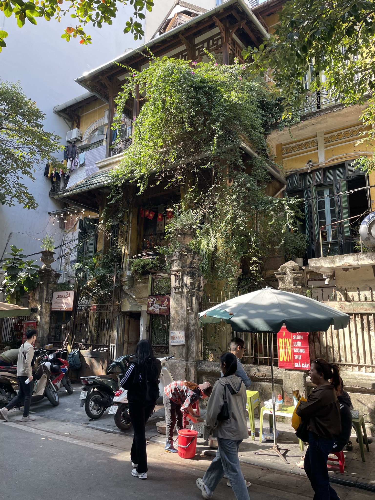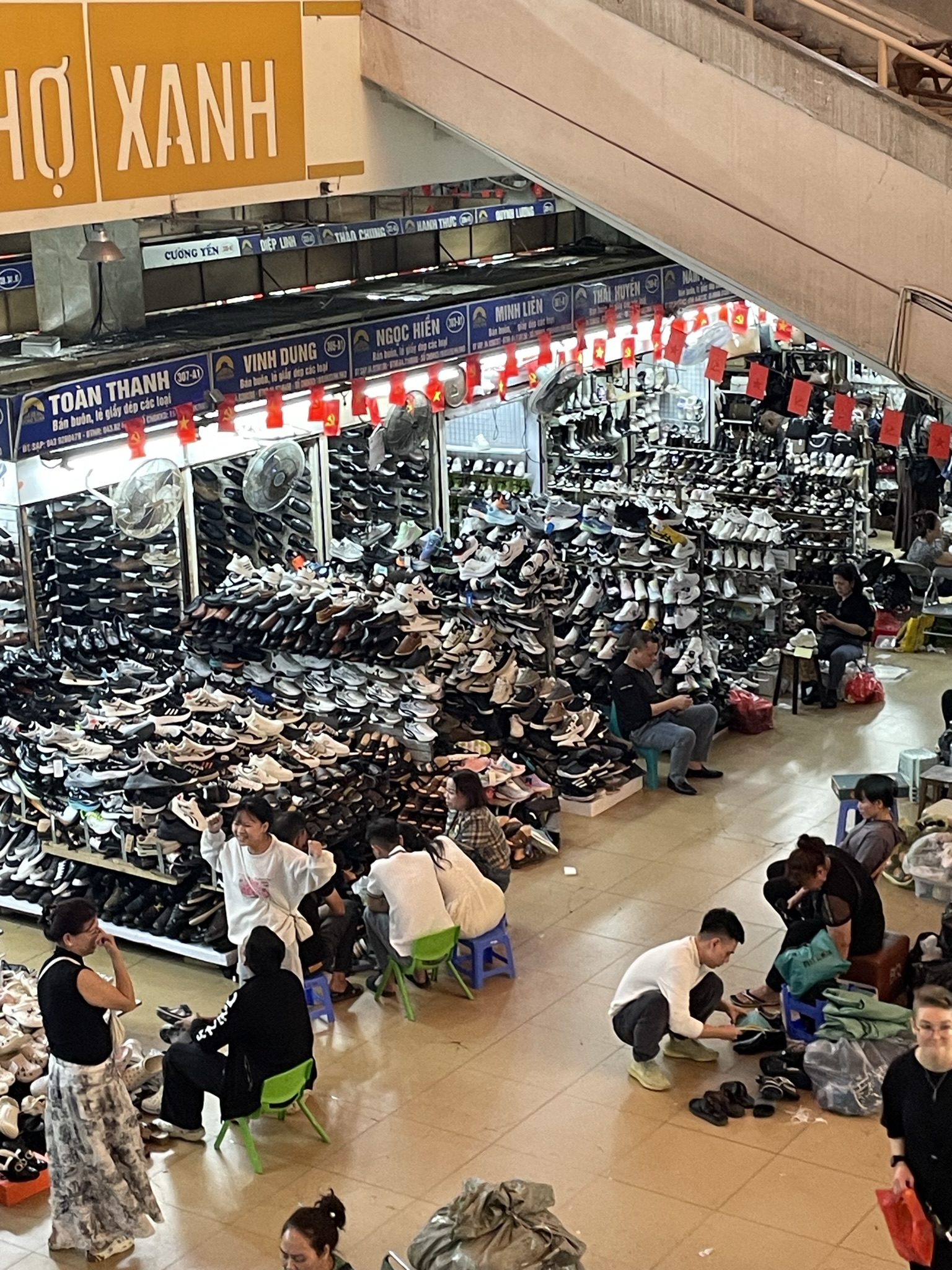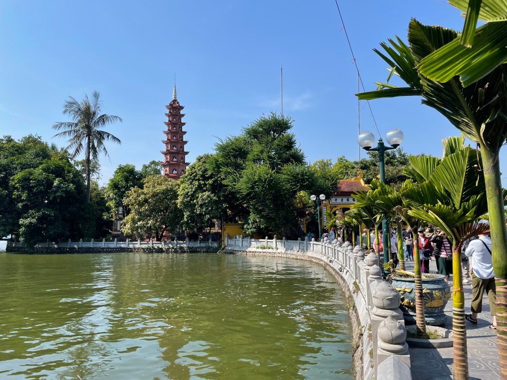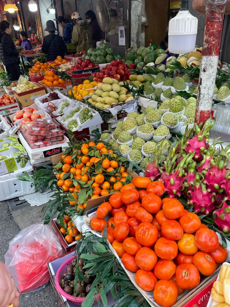 For every such hotspot, there is so much more Hanoi that beckons on, off, or near the tourist trails that cross the city. On a solo wander west of the Old Quarter, I went by the Hanoi train station, a jarring mix of (what else) French colonial wings and a starkly modern main hall. The latter is a modern, utilitarian addition after the original was wiped out by American bombs. The architecture is not to my taste, but the blended building is decidedly unique, a marker of resiliency and determination. Nearby, the Soviet-Vietnamese Friendship Centre, of a similar vintage, was obscured behind construction hoarding, disappointing me initially before I realized it was construction for a new metro station. The city is in the early stages of building out a rail system, which I absolutely made a point to ride. Highlights included fantastic views from the elevated guideway and a bizarre ticketing system where a booth attendant sticks a QR code sticker on your hand which you wave over the fare gate. That was a new one. On foot again, I navigated back alleys, alive and active with fruit and vegetable sellers, beyond the Quan Su Pagoda, a 500-year old temple tucked behind another busy street, where I tiptoed barefoot around a handful of fervently praying locals. Hanoi is nothing if not busy and varied.